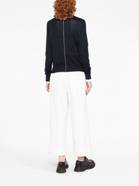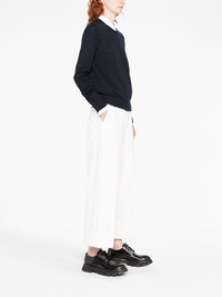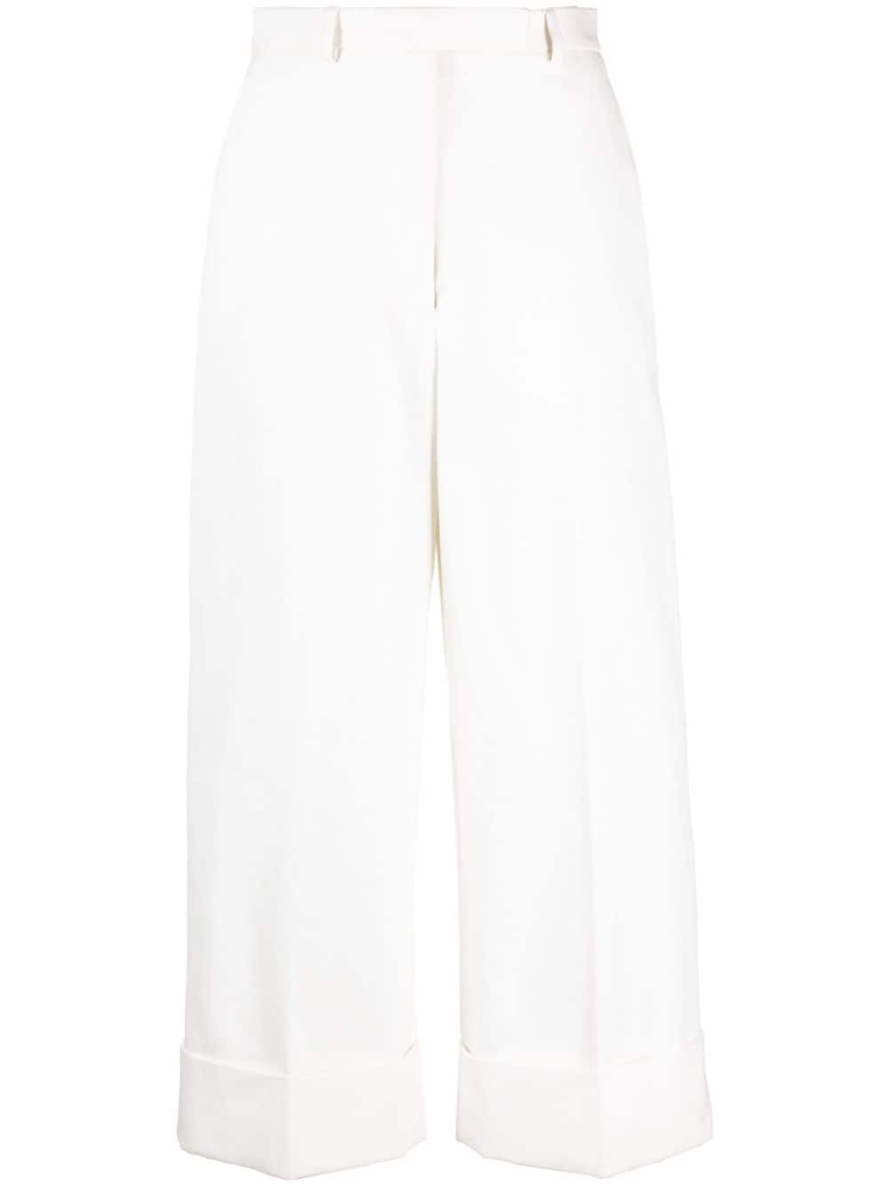 high-waisted wide-leg trousers Thom Browne showcases a penchant for classic tailored design with these off-white trousers, cut to an elegant wide-leg silhouette. Sitting high at the waist, they're subtly detailed with the brand's signature RWB stripe. Highlights - Off-white - Cotton - Rwb stripe - High-waisted - Tailored cut - Belt loops - Concealed front fastening - Rear welt pocket - Wide leg - Turn-up cuffs Made in Italy Composition Outer: Cotton 100% SIZE & FIT Model measurements Height 5 ft 10 in(1.77 m) Bust/Chest 27.95 in(71 cm) Hips 33.85 in(86 cm) Waist 23.22 in(59 cm) FittingInformation Designed for a straight-leg fit, these trousers allow for a close fit at the waist and an unrestricted, comfortable fit over the leg Cropped in length Made from a midweight non-stretch fabric, this piece offers minimal elasticity when worn This piece fits true to size – take your usual size Measurement BACK RISE 17.32 in(44 cm) FRONT RISE 13.38 in(34 cm) Hem Width 10.62 in(27 cm) HIPS 38.58 in(98 cm) INSIDE LEG 24.4 in(62 cm) Outside Leg 37.4 in(95 cm) WAIST 25.19 in(64 cm)