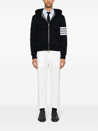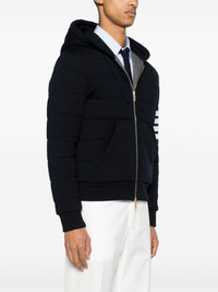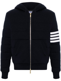 4-Bar stripe hooded jacket Highlights - Navy blue - Virgin wool - Jersey texture - Signature 4-bar stripe - Signature grosgrain loop tab - Ribbed trim - Padded design - Drawstring hood - Front two-way zip fastening - Long sleeves - Two side welt pockets - Straight hem Made in Italy Composition Lining: Cupro 100% Outer: Virgin Wool 100% SIZE & FIT Model measurements Height 6 ft 2 in(1.87 m) Bust/Chest 38.18 in(97 cm) Hips 36.61 in(93 cm) Waist 29.13 in(74 cm) FittingInformation Designed for a relaxed fit, this piece allows for comfort and movement when worn The ribbed hem offers a close, comfortable fit Made from a midweight fabric This piece fits true to size – take your usual size