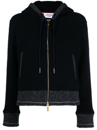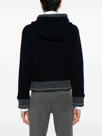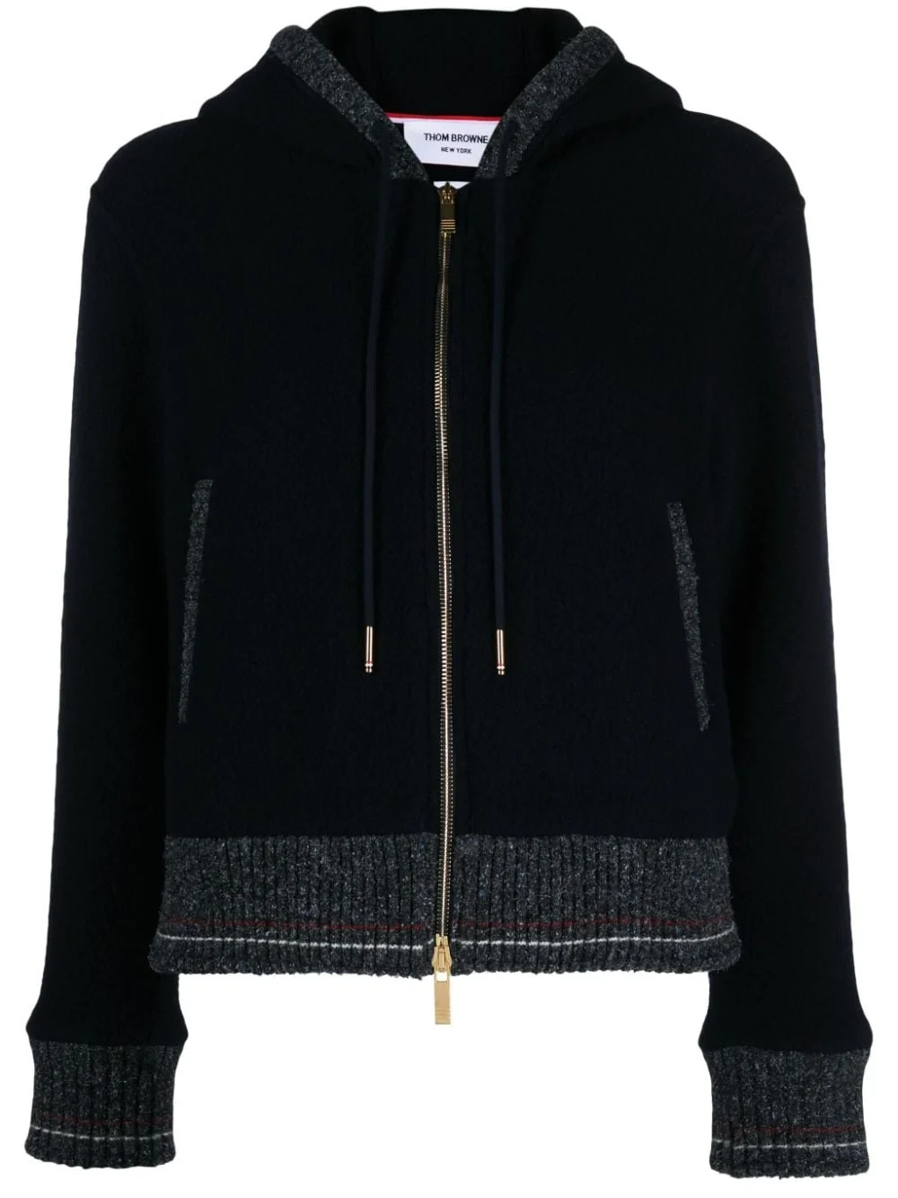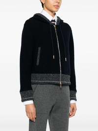 hooded zip-up wool cardigan Highlights - Navy blue/multicolour - Wool - Fleece texture - Signature grosgrain loop tab - Contrasting ribbed trim - Striped edge - Gold-tone hardware - Drawstring hood - Front two-way zip fastening - Drop shoulder - Long sleeves - Ribbed cuffs - Two diagonal pockets to the sides - Ribbed hem Made in Italy Composition Wool 100% SIZE & FIT Model measurements Height 5 ft 9 in(1.76 m) Bust/Chest 31.88 in(81 cm) Hips 35.43 in(90 cm) Waist 24.8 in(63 cm) FittingInformation Designed for a relaxed fit, this piece allows for comfort and movement when worn The ribbed hem offers a close, comfortable fit Made with a midweight knit, this piece offers some stretch This piece fits true to size – take your usual size Washing instructions Dry Clean Only