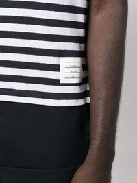 horizontal-stripe short-sleeve T-shirt Instantly recognisable as Thom Browne by the signature grosgrain loop, this T-shirt is constructed from sophisticated materials and has a sleek silhouette that reflects the brand's tailored approach to garment construction. Highlights - Black/white - Cotton - Horizontal stripe pattern - Logo patch to the side - Round neck - Short sleeves Made in Italy Composition Outer: Linen/Flax 96%, Elastane 4% SIZE & FIT Model measurements Height 6 ft 2 in(1.87 m) Bust/Chest 36.41 in(92.5 cm) Hips 37 in(94 cm) Waist 29.52 in(75 cm) FittingInformation Designed for a relaxed fit, this piece allows for comfort and movement when worn Made from a midweight non-stretch fabric, this piece offers minimal elasticity when worn This piece fits true to size – take your usual size