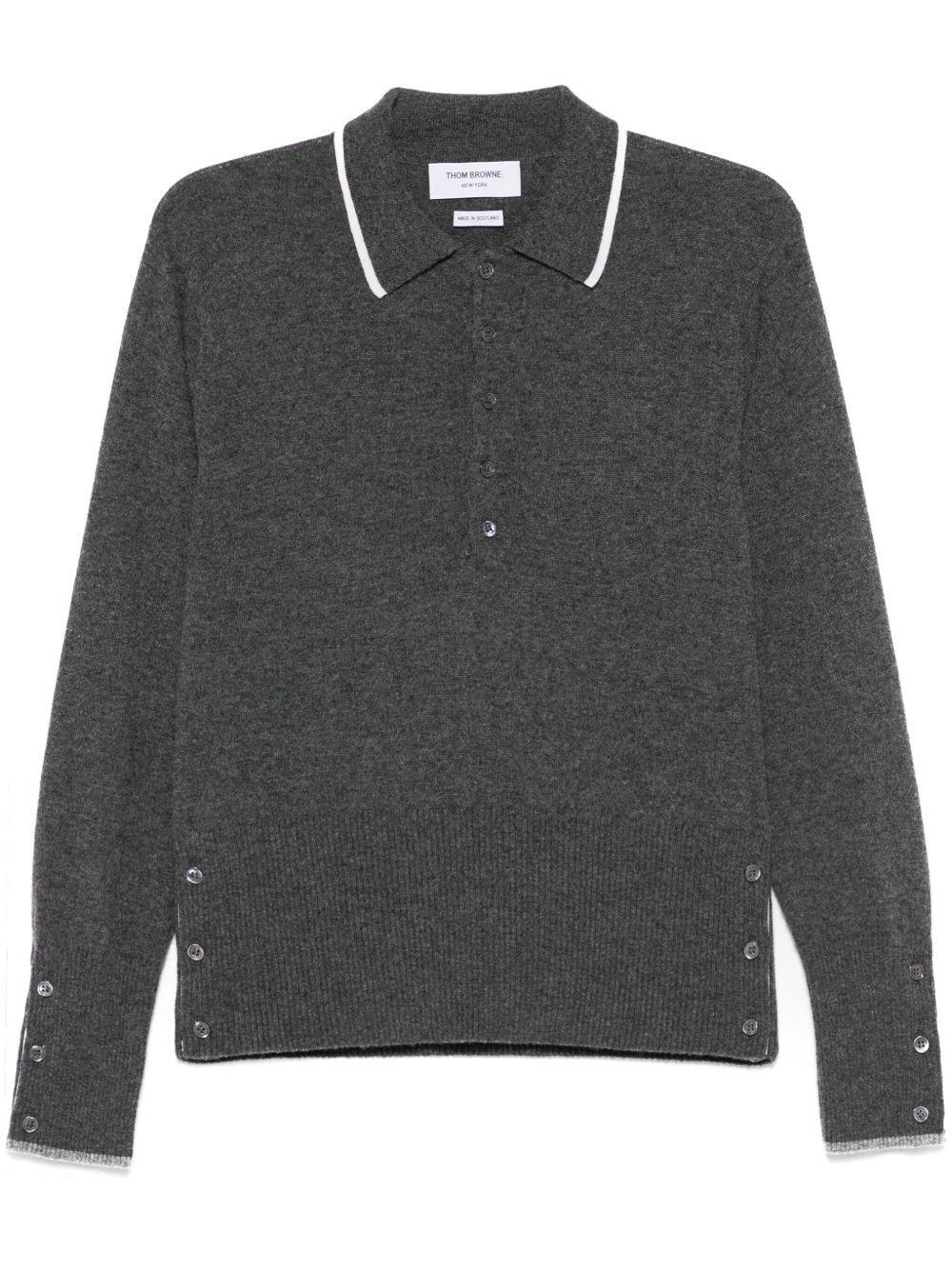 intarsia cashmere long-sleeves polo shirt Highlights - Medium grey - Front button placket - Side button fastening - Buttoned cuffs - Signature grosgrain side tabs Made in United Kingdom Composition Cashmere 100% SIZE & FIT Model measurements Height 6 ft 2 in(1.87 m) Bust/Chest 38.18 in(97 cm) Hips 36.61 in(93 cm) Waist 29.13 in(74 cm) FittingInformation Designed for a slim fit, this polo shirt offers a comfortable fit that sits just away from the body The ribbed hem offers a close, comfortable fit Made with a midweight knit, this piece offers some stretch Washing instructions Dry Clean Only