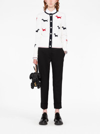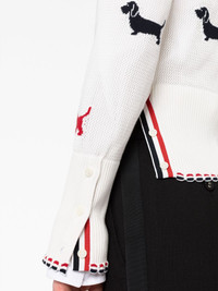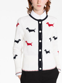 intarsia-knit Hector cotton cardigan A classic with a Thom Browne twist. Crafted from cotton, this rounded-collar cardigan is highlighted with the brand's most iconic motif – the famous mascot Hector in intarsia-knit and the RWB stripes at the edges – finished with some contrasting trims. Highlights - White/multicolour - Cotton - Knitted construction - Patterned intarsia knit - Contrasting trim - Round neck - Front button placket - Long sleeves - Straight hem - Side button fastening - Rwb stripe Made in Italy Composition Cotton 99%, Polyamide 1% SIZE & FIT Model measurements Height 5 ft 10 in(1.77 m) Bust/Chest 27.95 in(71 cm) Hips 33.85 in(86 cm) Waist 23.22 in(59 cm) Measurement SLEEVE LENGTH 22.83 in(58 cm) LENGTH 21.65 in(55 cm) WAIST 30.7 in(78 cm) FittingInformation Designed for a slim fit that sits just away from the body offering a close yet comfortable fit Made with a midweight knit, this piece offers some stretch This piece fits true to size – take your usual size