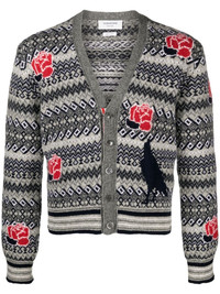 intarsia-knit wool-blend cardigan Spun from a blend of wool and mohair, Thom Browne's cardigan is intarsia-knit with a fair isle pattern in shades of grey and black, punctuated with vibrant red roses. A signature RWB grosgrain loop adorns the nape. Highlights - Grey/multicolour - Wool-mohair blend - Brushed effect - Patterned intarsia knit - Floral intarsia knit - Rwb stripe - Signature grosgrain loop tab - Signature grosgrain side tabs - Stripe trim - V-neck - Front button fastening - Long sleeves - Ribbed cuffs and hem Made in Italy Composition Wool 90%, Mohair 10% SIZE & FIT Model measurements Height 6 ft 2 in(1.87 m) Bust/Chest 36.41 in(92.5 cm) Hips 37 in(94 cm) Waist 29.52 in(75 cm) FittingInformation Designed for a slim fit, offering a comfortable fit that sits just away from the body Made with a midweight knit, this piece offers some stretch This piece fits true to size – take your usual size
