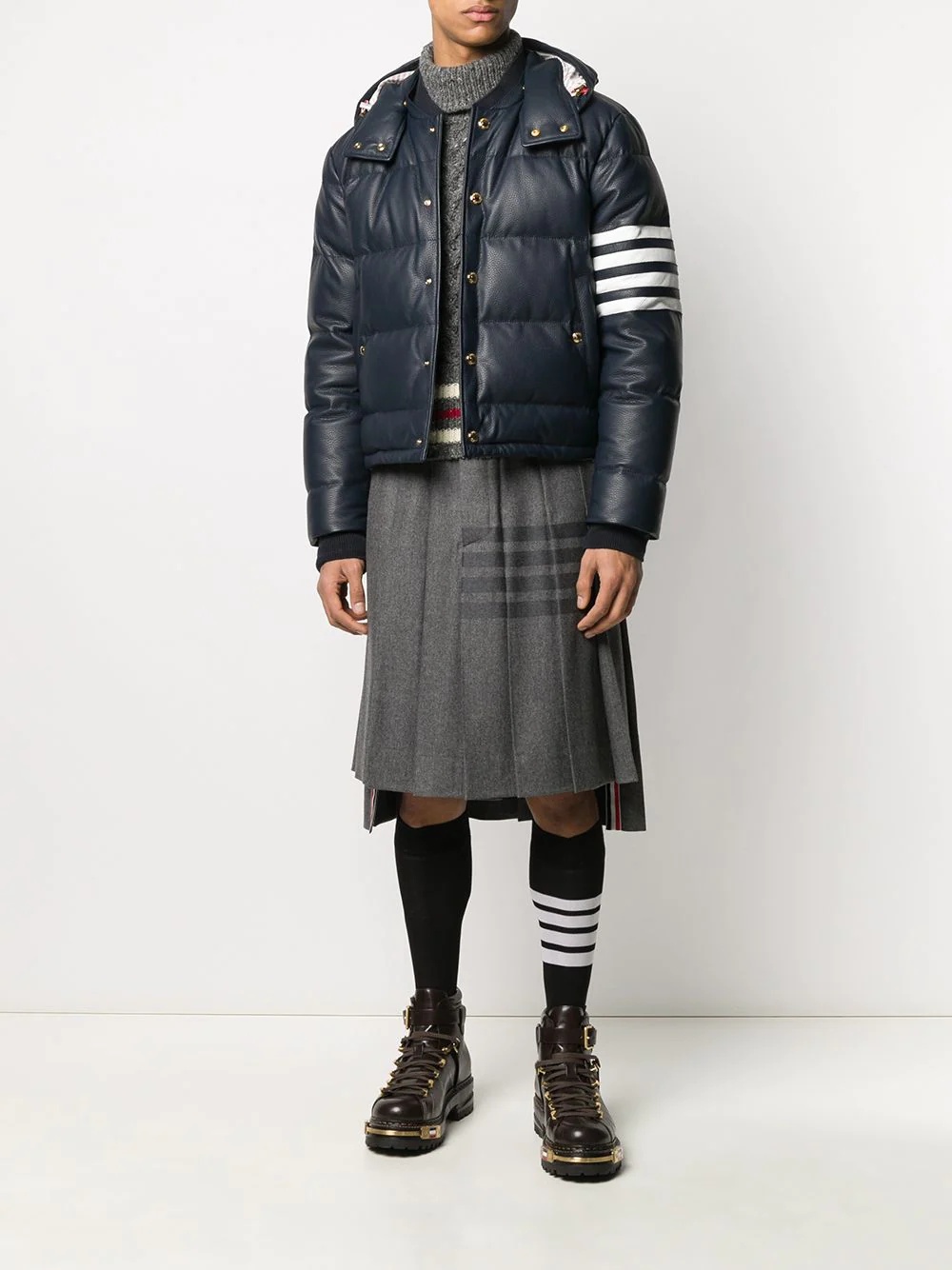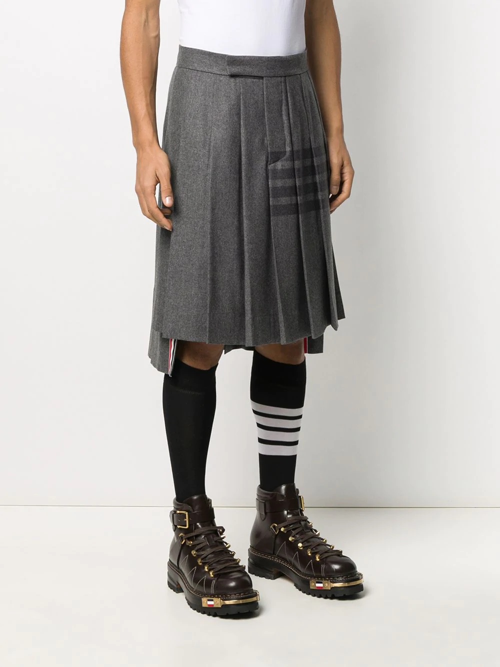 knee-length pleated 4-Bar striped skirt Who said men don't wear skirts? Not Thom Browne for sure! Spun from soft wool and cashmere blend, this knee-length pleated 4-Bar striped skirt is for the ones who are not afraid to show their rebellious side. Go edgy or go home! Featuring a concealed front fastening, a pleated design, a knee length and a tonal 4-bar detail. Made in Italy Composition Wool 95%, Cashmere 5% SIZE & FIT Model measurements Height 6 ft 1 in(1.86 m) Bust/Chest 37 in(94 cm) Hips 37 in(94 cm) Waist 28.7 in(73 cm) FittingInformation This piece fits true to size. We recommend you get your regular size Designed for a slim fit at the waist and loose over the leg Made with a mid-weight non-stretch fabric