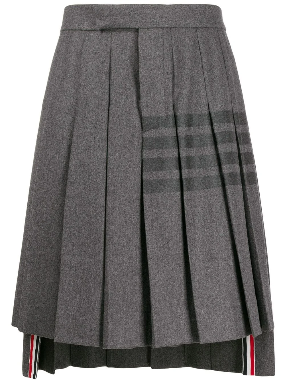 knee-length pleated 4-Bar striped skirt Highlights - Who said men don't wear skirts? not thom browne for sure! spun from soft wool and cashmere blend, this knee-length pleated 4-bar striped skirt is for the ones who are not afraid to show their rebellious side. go edgy or go home! featuring a concealed front fastening, a pleated design, a knee length and a tonal 4-bar detail. Made in Italy Composition Wool 95%, Cashmere 5% SIZE & FIT Model measurements Height 6 ft 2 in(1.87 m) Bust/Chest 38.18 in(97 cm) Hips 36.61 in(93 cm) Waist 29.13 in(74 cm) FittingInformation This piece fits true to size. We recommend you get your regular size Designed for a slim fit at the waist and loose over the leg Made with a mid-weight non-stretch fabric Washing instructions Dry Clean Only