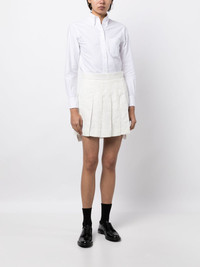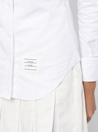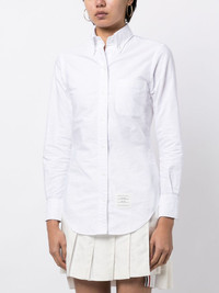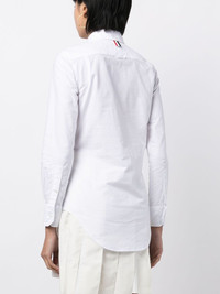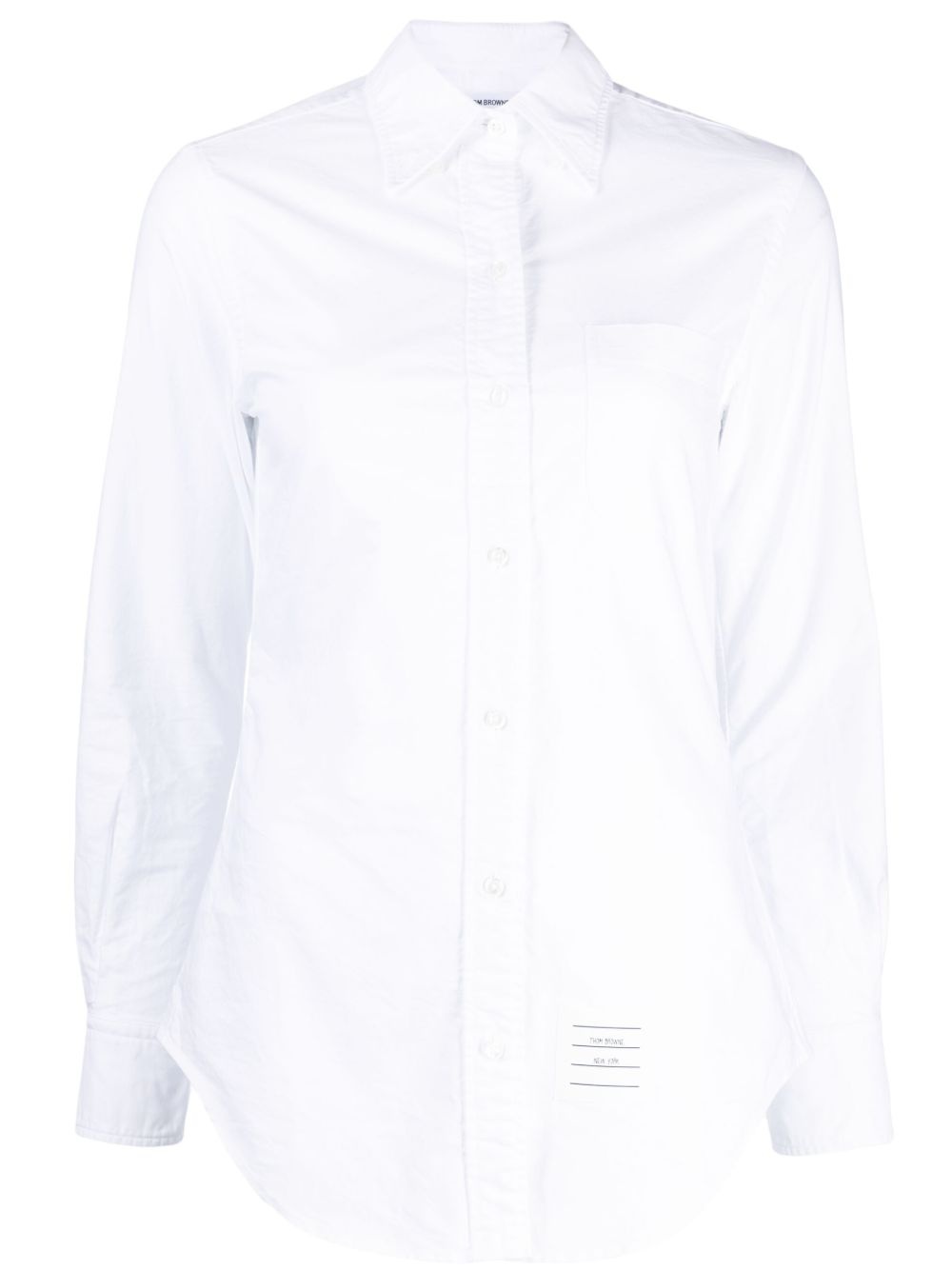 logo-applique cotton shirt Thom Browne’s collections are underpinned by a focus on immaculate tailoring. A case in point, this shirt is cut from white cotton poplin to a classic curved silhouette for easy tucking. It’s finished with a signature Name Tag applique at the front, recalling the brand’s workwear aesthetic. Highlights - White - Cotton - Poplin texture - Rwb stripe - Applique logo - Button-down collar - Front button fastening - Long sleeves - Buttoned cuffs - Chest patch pocket - Curved hem Made in Italy Composition Cotton 100% SIZE & FIT Model measurements Height 5 ft 10 in(1.77 m) Bust/Chest 31.49 in(80 cm) Hips 35.43 in(90 cm) Waist 25.19 in(64 cm)