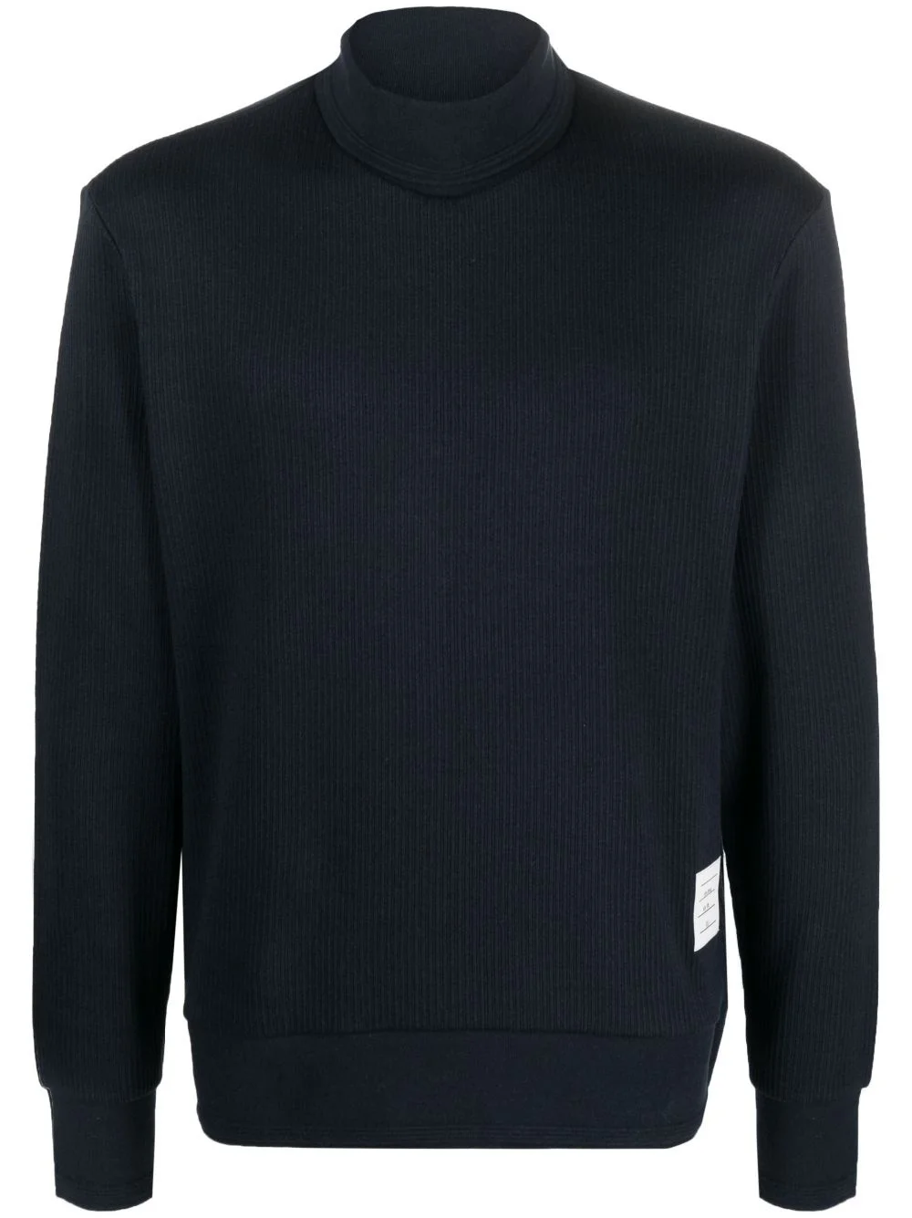 long-sleeve jumper This cotton jumper from Thom Browne boasts a high-neck silhouette and is adorned with the brand's signature grosgrain loop tab to the rear, alongside a familiar logo patch to the front. Highlights - Navy blue - Cotton - Knitted construction - Logo patch to the front - Signature grosgrain loop tab - High neck - Long sleeves Imported Composition Cotton 100% SIZE & FIT Model measurements Height 6 ft 2 in(1.88 m) Bust/Chest 37.79 in(96 cm) Hips 35.82 in(91 cm) Waist 29.92 in(76 cm) Measurement CHEST 45.66 in(116 cm) SLEEVE LENGTH 25.59 in(65 cm) LENGTH 25.19 in(64 cm) FittingInformation Designed for a relaxed fit, this piece allows for comfort and movement when worn Made with a midweight knit, this piece offers some stretch This piece fits true to size – take your usual size Washing instructions Hand Wash