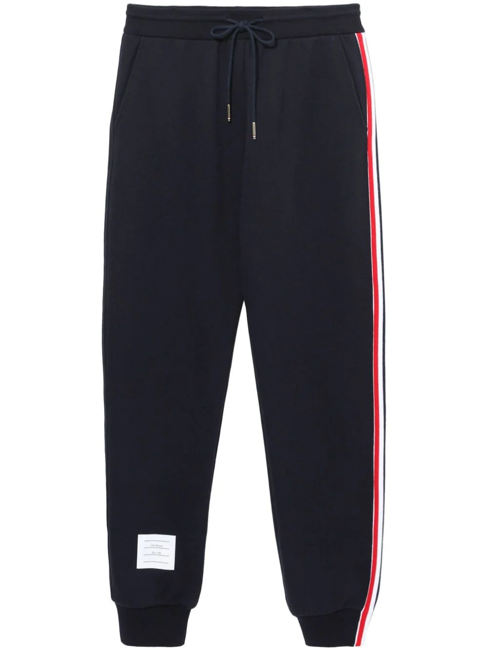 loopback stripe track pants You could wear these RWB-stripe Thom Browne track pants out and about. They would certainly show off your laid-back, preppy style. Or you could take advantage of their comfort factor and wear them to relax and watch TV. No judgement here. Highlights - Navy/red/white - Cotton - Drawstring fastening waist - Signature grosgrain loop tab - Slim fit - Rwb stripe - Logo patch to the front - Elasticated ankles Made in Italy Composition Cotton 100% SIZE & FIT Model measurements Height 5 ft 10 in(1.77 m) Bust/Chest 35.03 in(89 cm) Hips 35.03 in(89 cm) Waist 23.62 in(60 cm) Measurement HIPS 36.22 in(92 cm) WAIST 22.83 in(58 cm) FittingInformation This piece fits true to size. We recommend you get your regular size Cut for a slim fit Made with a mid-weight fabric Washing instructions Machine Wash