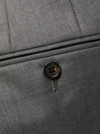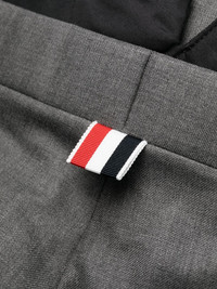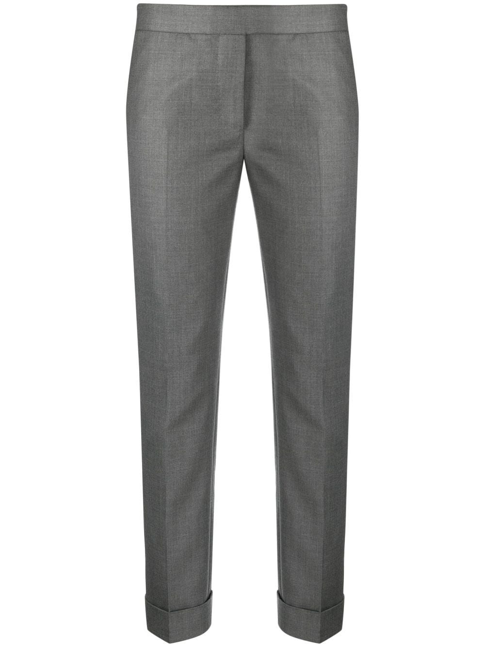 Super 120s cropped wool trousers Thom Browne's affinity for sleek silhouettes is captured in the clean lines of these medium-grey wool trousers. Crafted with an adjustable buttoned backstrap at the notched rear waist, they're finished with a striped grosgrain loop tab that nods to the label's archival codes. Highlights - Medium grey - Wool - Signature grosgrain loop tab - Gold-tone hardware - High waist - Concealed front zip fastening - Two side slip pockets - Adjustable strap to the rear - Two rear button-fastening jetted pockets - Silk lining - Wide cuffs - Cropped Made in Italy Composition Wool 100%