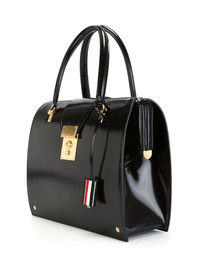 Mrs. Thom leather bag You need a bag which says 'I mean business'. Thom Browne has just the thing in the form of this black calfskin Mrs Thom bag. Go get 'em. Featuring round top handles, a push lock fastening, a signature tri-colour striped trim, an internal zipped pocket, a striped pattern, gold-tone hardware and a back embossed logo stamp. Made in Italy Composition Outer: Calf Leather 100% Lining: Calf Leather 100% SIZE & FIT Model measurements Height 5 ft 10 in(1.77 m) Bust/Chest 33.85 in(86 cm) Hips 33.85 in(86 cm) Waist 23.22 in(59 cm) Measurement WIDTH 13.38 in(34 cm) HEIGHT 10.23 in(26 cm) HANDLE 8.66 in(22 cm) DEPTH 4.72 in(12 cm)