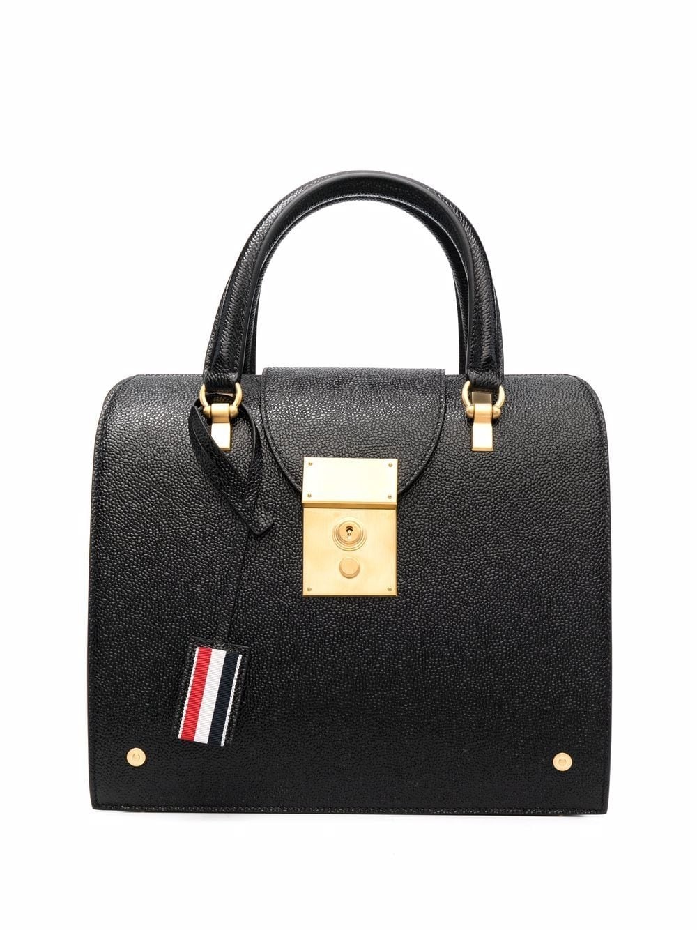 Mrs.Thom pebble-texture satchel bag Boasting a spacious design, Thom Browne's Mrs. Thom bag is practical and modern. Defined by its pebbled texture, this iteration features a foldover top with polished twist-lock closure. Highlights - Black - Leather - Logo tag - Gold-tone logo lettering - Pebbled texture - Gold-tone hardware - Foldover top - Twist-lock fastening - Two rounded top handles - Main compartment Made in Italy Composition Outer: Calf Leather 100% SIZE & FIT Model measurements Height 5 ft 11 in(1.8 m) Bust/Chest 33.07 in(84 cm) Hips 37.4 in(95 cm) Waist 25.19 in(64 cm)
