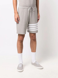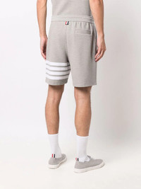 Ottoman striped track shorts Thom Browne presents these Ottoman track shorts from its SS22 collection. Crafted in 100% cotton for ultimate comfort, this drawstring pair is instantly recognisable with its signature 4-bar striped detail in constrast white. Highlights - Grey - Cotton - Signature 4-bar stripe - Drawstring fastening waist - Two side slash pockets - Slip pocket to the rear Made in Italy Composition Cotton 100% SIZE & FIT Model measurements Height 6 ft 1 in(1.86 m) Bust/Chest 35.43 in(90 cm) Hips 35.43 in(90 cm) Waist 29.92 in(76 cm) Measurement FRONT RISE 14.17 in(36 cm) WAIST 29.92 in(76 cm)