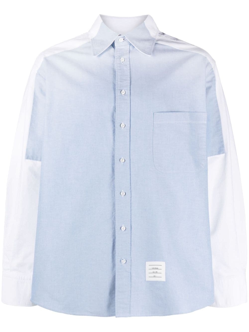 panelled cotton shirt Famed for its original tailoring, Thom Browne translates its creativity into this shirt from the SS24 collection. It is cut from cotton to a slightly oversize silhouette, while a panelled design nods to the label's penchant for geometric shapes. Highlights - White/light blue - Cotton - Panelled design - Signature grosgrain loop tab - Rwb stripe - Pointed flat collar - Front button fastening - Chest patch pocket - Long sleeves - Buttoned cuffs - Curved hem Made in Italy Composition Outer: Cotton 100% SIZE & FIT Model measurements Height 6 ft 2 in(1.87 m) Bust/Chest 36.41 in(92.5 cm) Hips 37 in(94 cm) Waist 29.52 in(75 cm) FittingInformation Designed for a regular fit, allowing for a comfortably loose fit throughout the body Made from a midweight non-stretch fabric This piece fits true to size – take your usual size