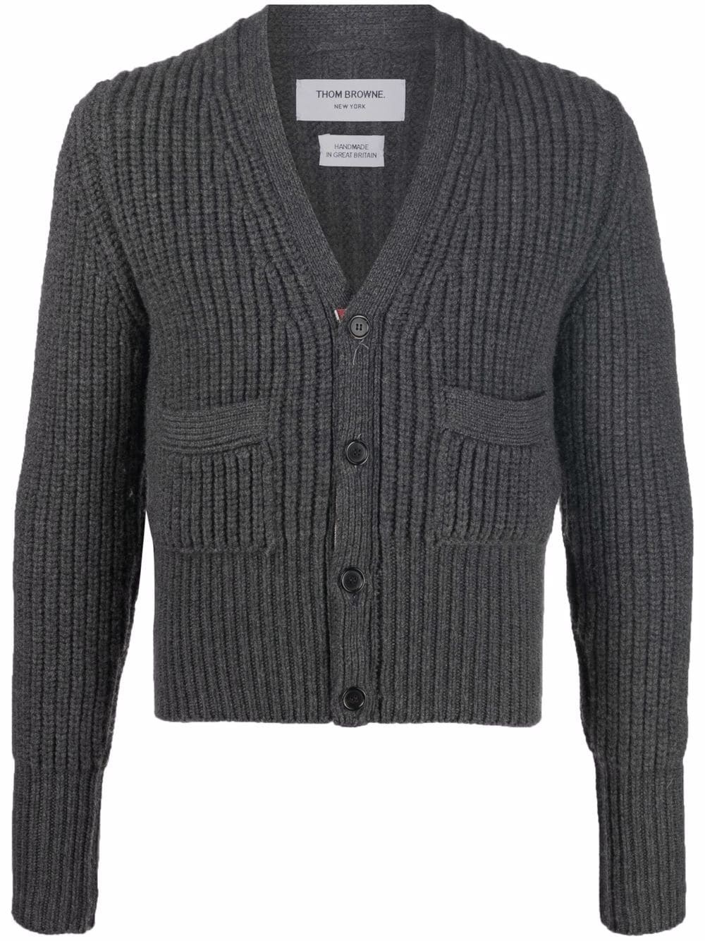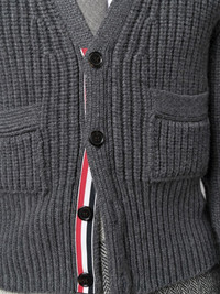 patch-pocket cashmere cardigan Woven in soft cashmere, this Thom Browne cardigan is crafted in a chunky cardigan stitch. The slate-grey design is enhanced with two front pouch pockets, showcasing the brand's preppy aesthetic. Made in United Kingdom Composition Cashmere 100% SIZE & FIT Model measurements Height 6 ft 2 in(1.89 m) Bust/Chest 37.79 in(96 cm) Hips 37 in(94 cm) Waist 29.92 in(76 cm) FittingInformation This piece fits true to size. We recommend you get your regular size Cut for a relaxed fit Made with a mid-weight fabric