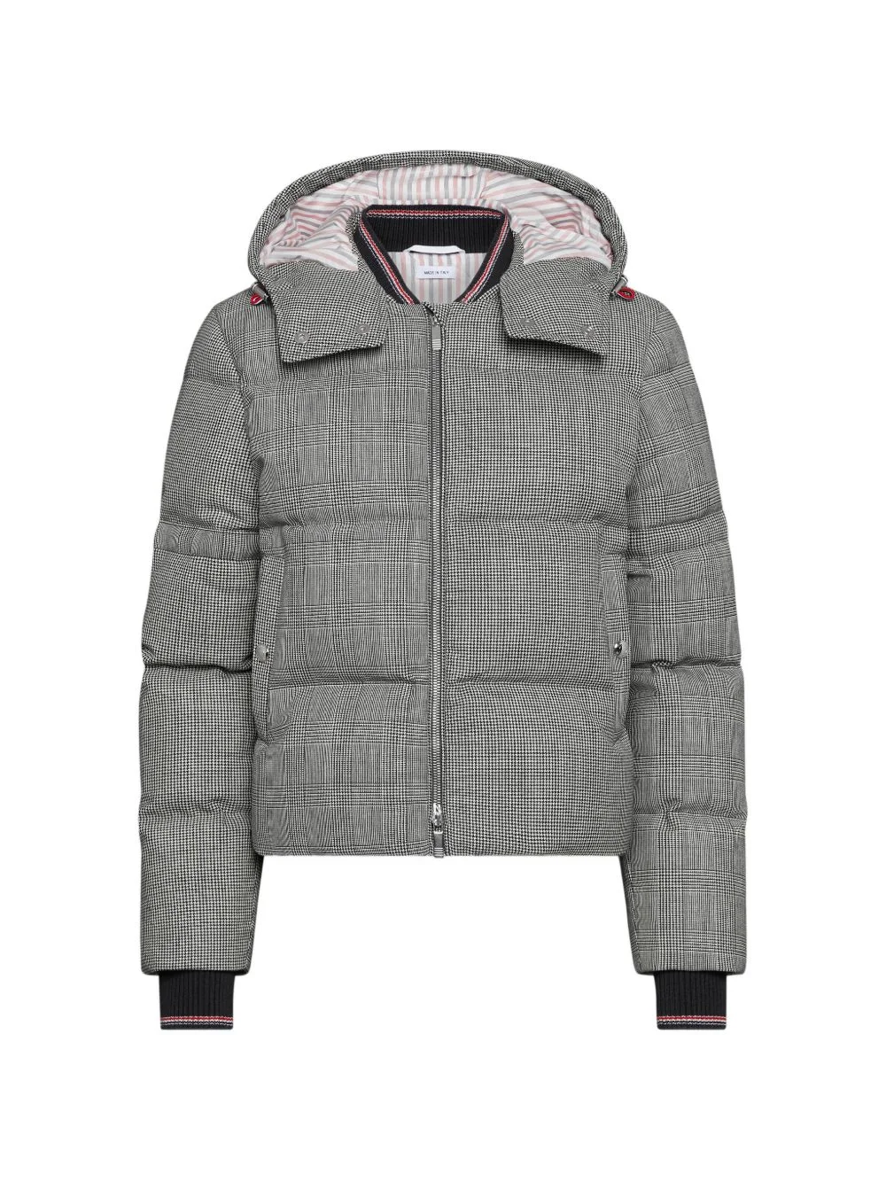 patterned hooded jacket Highlights - Grey - Prince of wales pattern - Ribbed cuffs - Front zip fastening - Hooded - Snap fastening Made in Italy Composition Outer: Wool 95%, Polyester 3%, Polyamide 2% Lining: Polyester 100%, Goose Down 80%, Goose Feather 20% Washing instructions Read Manufacturer Guidelines