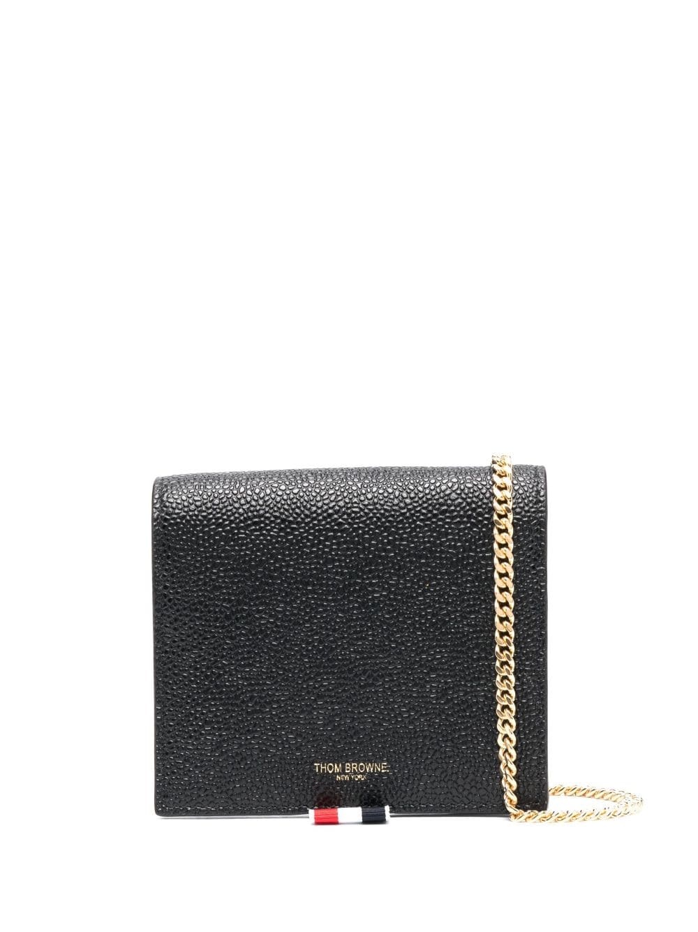 pebbled bi-fold wallet Presented in pebbled grain leather, this wallet from Thom Browne incorporates the brand's signature RWB stripe into the foldover top. It features a gold-tone chain strap so you can wear it over the shoulder or across the body. Highlights - Black - Calf leather - Pebbled texture - Signature grosgrain loop tab - Embossed logo to the front - Press-stud fastening - Chain-link shoulder strap - Internal card slots - Internal zip-fastening pocket Imported Composition Outer: Calf Leather 100% SIZE & FIT Measurement DEPTH 0.78 in(2 cm) LENGTH 4.72 in(12 cm) STRAP 18.5 in(47 cm) WIDTH 3.93 in(10 cm)