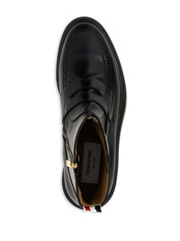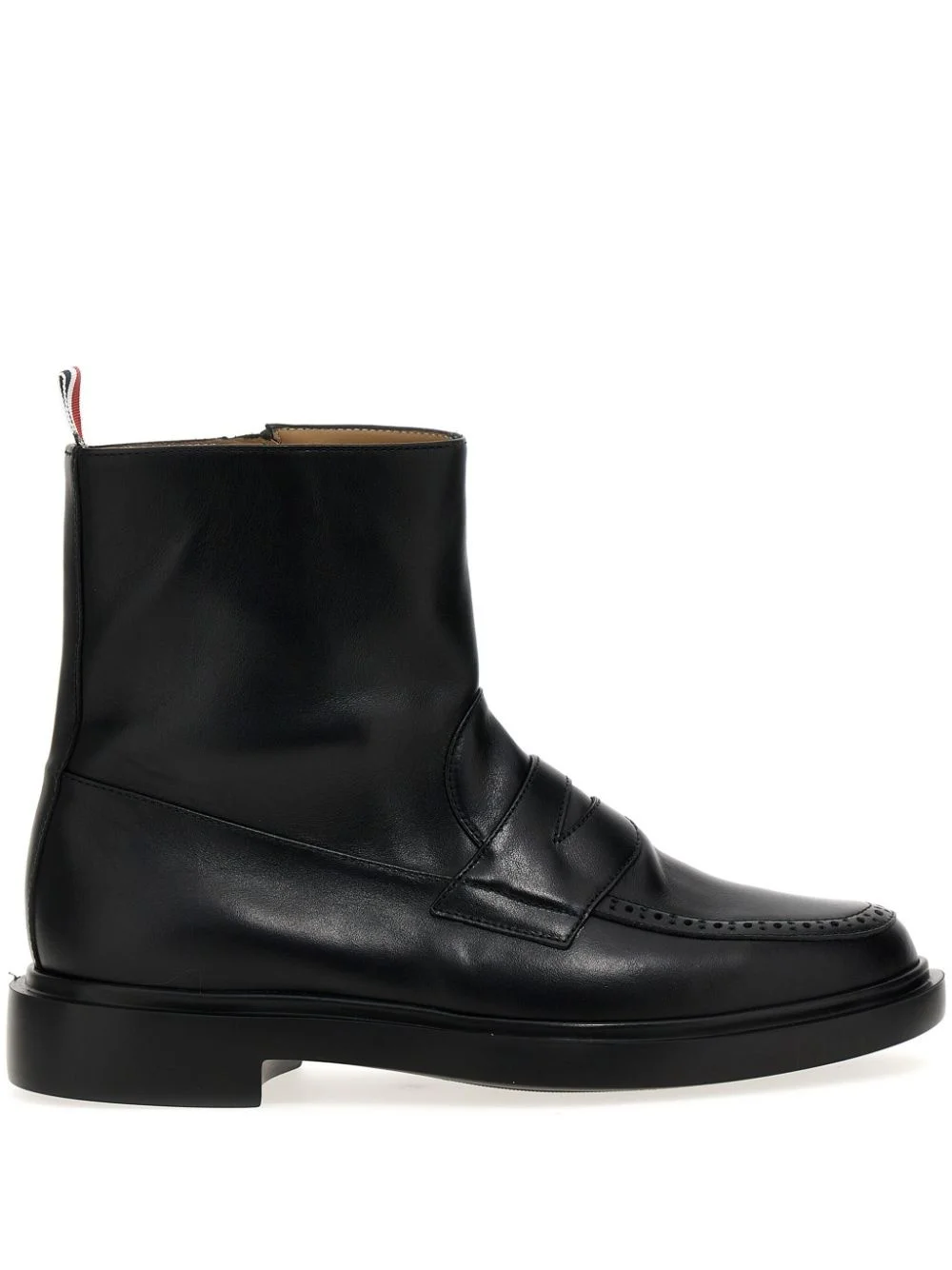 penny slot-detail ankle boots Thom Browne's ankle boots are inspired by penny loafers. Crafted from supple black leather, they feature a penny slot and brogue-inspired detailing. Notice the RWB pull-tab, a brand signature. Highlights - Black - Calf leather - Pull-tab at the heel - Penny slot - Short side zip fastening - Almond toe Made in Italy Composition Lining: Calf Leather 100% Outer: Calf Leather 100% Sole: Rubber 100% SIZE & FIT Measurement CIRCUMFERENCE 11.02 in(28 cm) HEEL 1.37 in(3.5 cm) HEIGHT 6.88 in(17.5 cm) Sole height 0.59 in(1.5 cm)