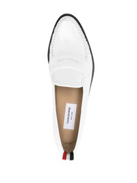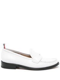 penny-slot RWB loafers Rendered in bright white, these loafers from Thom Browne are detailed with the signature RWB stripe pull-tab, lending an instantly recognisable touch. They're constructed for a sleek pointed toe silhouette, complete with a classic penny slot. Highlights - White/black - Calf leather - Rwb stripe - Penny slot - Pointed toe - Pull-tab at the heel - Low block heel Made in Italy Composition Sole: Calf Leather 100% Outer: Patent Calf Leather 100% Lining: Calf Leather 100% SIZE & FIT Measurement HEEL 1.18 in(3 cm) Sole height 0.39 in(1 cm)