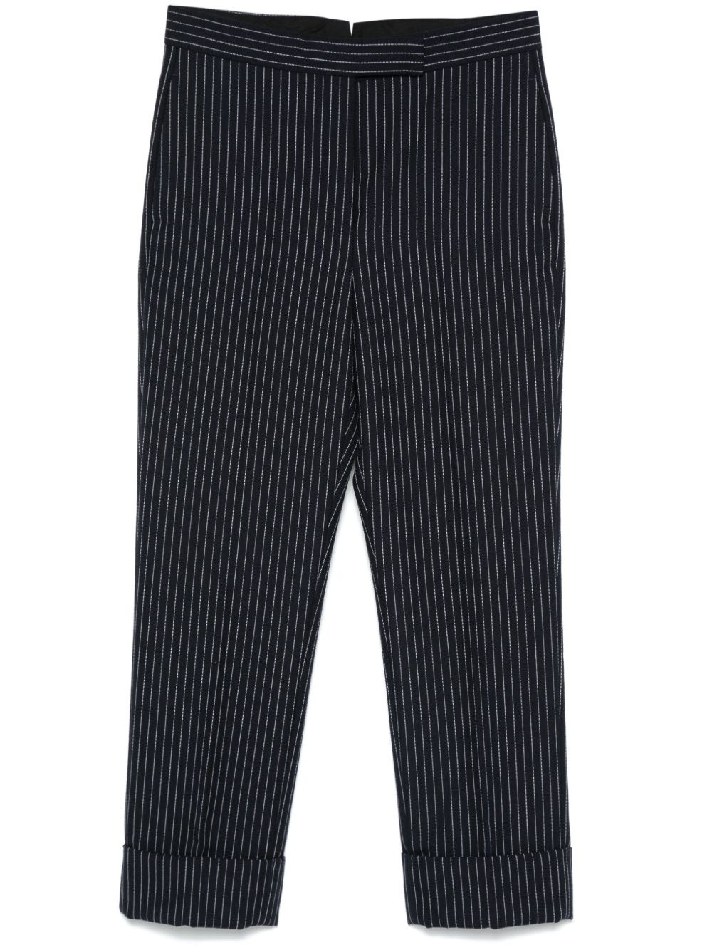 pinstripe trousers Highlights - Navy blue - Button fly fastening - Two side slit pockets - Two rear button-fastening pockets - Turn-up cuffs Made In Italy Composition Outer: Virgin Wool 97%, Polyester 3% Lining: Cupro 100% SIZE & FIT Model measurements Height 5 ft 11 in(1.8 m) Bust/Chest 31.49 in(80 cm) Hips 35.82 in(91 cm) Waist 24.8 in(63 cm) FittingInformation Designed with a cigarette cut, these trousers allow for a close fit at the waist and offer an unrestricted fit through to the ankle The adjustable tabs allow for fitted preferences Made from a midweight non-stretch fabric Washing instructions Dry Clean Only