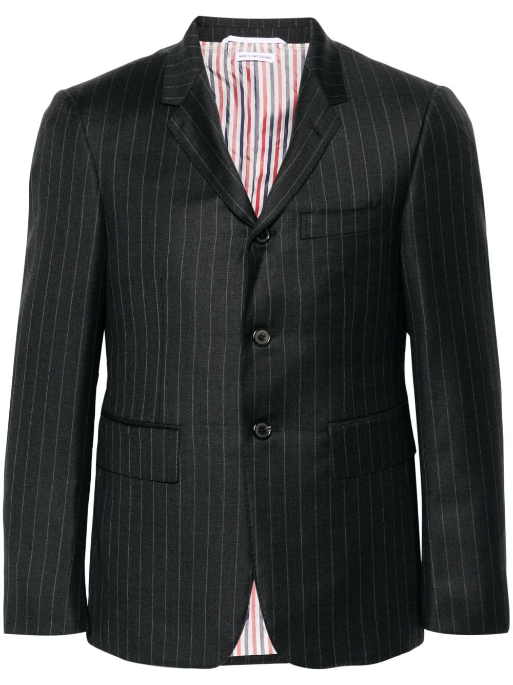 pinstripe wool blazer Highlights - Anthracite grey - Wool - Pinstripe pattern - Signature grosgrain loop tab - Notched lapels - Shoulder pads - Long sleeves - Buttoned-cuff sleeves - Chest welt pocket - Two side flap pockets - English rear vents - Multiple internal slip pockets - Rwb stripe lining - Front button fastening Imported Composition Lining: Cupro 100% Outer: Wool 100% SIZE & FIT Model measurements Height 6 ft 2 in(1.87 m) Bust/Chest 37.79 in(96 cm) Hips 37.79 in(96 cm) Waist 30.31 in(77 cm) FittingInformation Designed for a slim fit, offering a comfortable fit that sits just away from the body The vented hem offers movement at the rear Made from a midweight non-stretch fabric This piece fits true to size – take your usual size