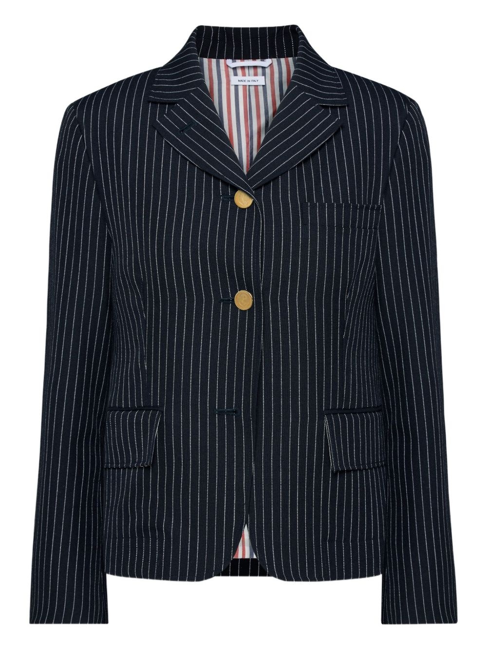 pinstriped fitted jackets Highlights - Navy blue - Pinstripe pattern - Front button fastening - Long sleeves Made in Italy Composition Outer: Virgin Wool 97%, Polyester 3% Lining: Cupro 100% SIZE & FIT Measurement LENGTH 20.86 in(53 cm) WAIST 31.49 in(80 cm) BUST 34.64 in(88 cm) Shoulder Width 14.56 in(37 cm) Washing instructions Read Manufacturer Guidelines