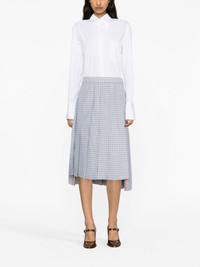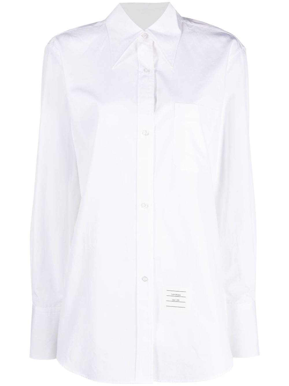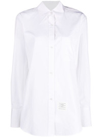 pointed-collar logo-patch shirt Renowned for enhancing classic designs with signature house details, Thom Browne presents this shirt. The long-sleeve design is defined by its oversized pointed collar and is enhanced with a logo patch to the front and signature grosgrain loop tab at the nape. Highlights - White - Logo patch to the front - Chest patch pocket - Front button fastening - Pointed flat collar - Long sleeves - Curved hem Made in Italy Composition Outer: Cotton 100% SIZE & FIT Model measurements Height 5 ft 10 in(1.78 m) Bust/Chest 31.49 in(80 cm) Hips 35.03 in(89 cm) Waist 23.62 in(60 cm) Measurement SLEEVE LENGTH 32.67 in(83 cm) LENGTH 32.28 in(82 cm) WAIST 39.37 in(100 cm) BUST 36.61 in(93 cm) FittingInformation Designed to be unstructured, offering a loose fit throughout Made from a midweight non-stretch fabric This piece fits true to size – take your usual size