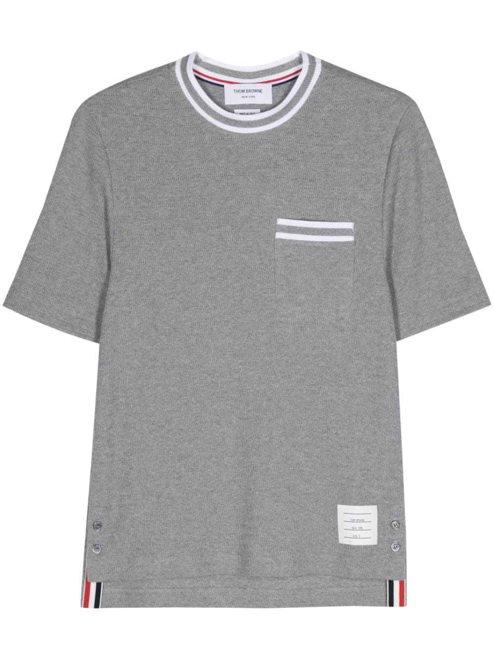pointelle cotton blend T-shirt Highlights - Light grey - Cotton blend - Pointelle knit - Stripe detailing - Crew neck - Short sleeves - Chest patch pocket - Logo tag - Short side slits - Signature grosgrain side tabs - High-low hem Made in Italy Composition Lining: Cotton 90%, Polyamide 9%, Polyurethane 1% Outer: Cotton 100% SIZE & FIT Measurement CHEST 44.09 in(112 cm) LENGTH 29.52 in(75 cm) Washing instructions Hand Wash