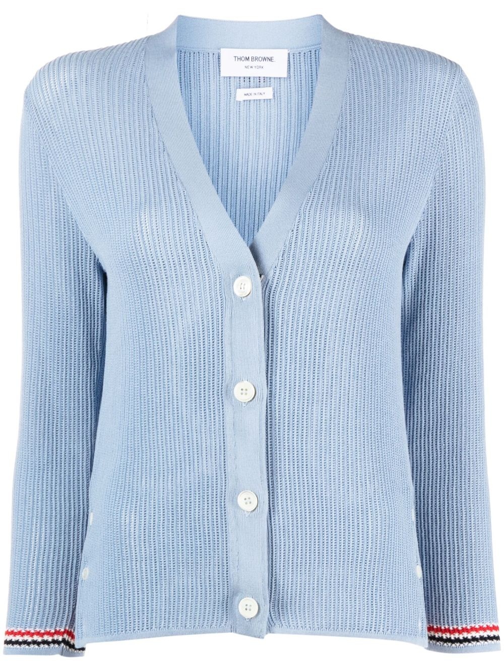 pointelle-knit RWB stripe cardigan Crafted from a cotton-silk blend in an intricate pointelle knit design, this Thom Browne cardigan boasts a classic V-neck and contrasting RWB stripe trim, showcasing the brand's penchant for timeless silhouettes and signature touches. Highlights - Light blue - Cotton-silk blend - Pointelle knit - Rwb stripe - V-neck - Front button fastening - Long sleeves - Straight hem Made in Italy Composition Cotton 70%, Silk 30% SIZE & FIT Model measurements Height 5 ft 11 in(1.8 m) Bust/Chest 31.88 in(81 cm) Hips 35.03 in(89 cm) Waist 24.01 in(61 cm) FittingInformation Designed for a slim fit that sits just away from the body offering a close yet comfortable fit Made with a lightweight knit, this piece offers some stretch This piece fits true to size – take your usual size