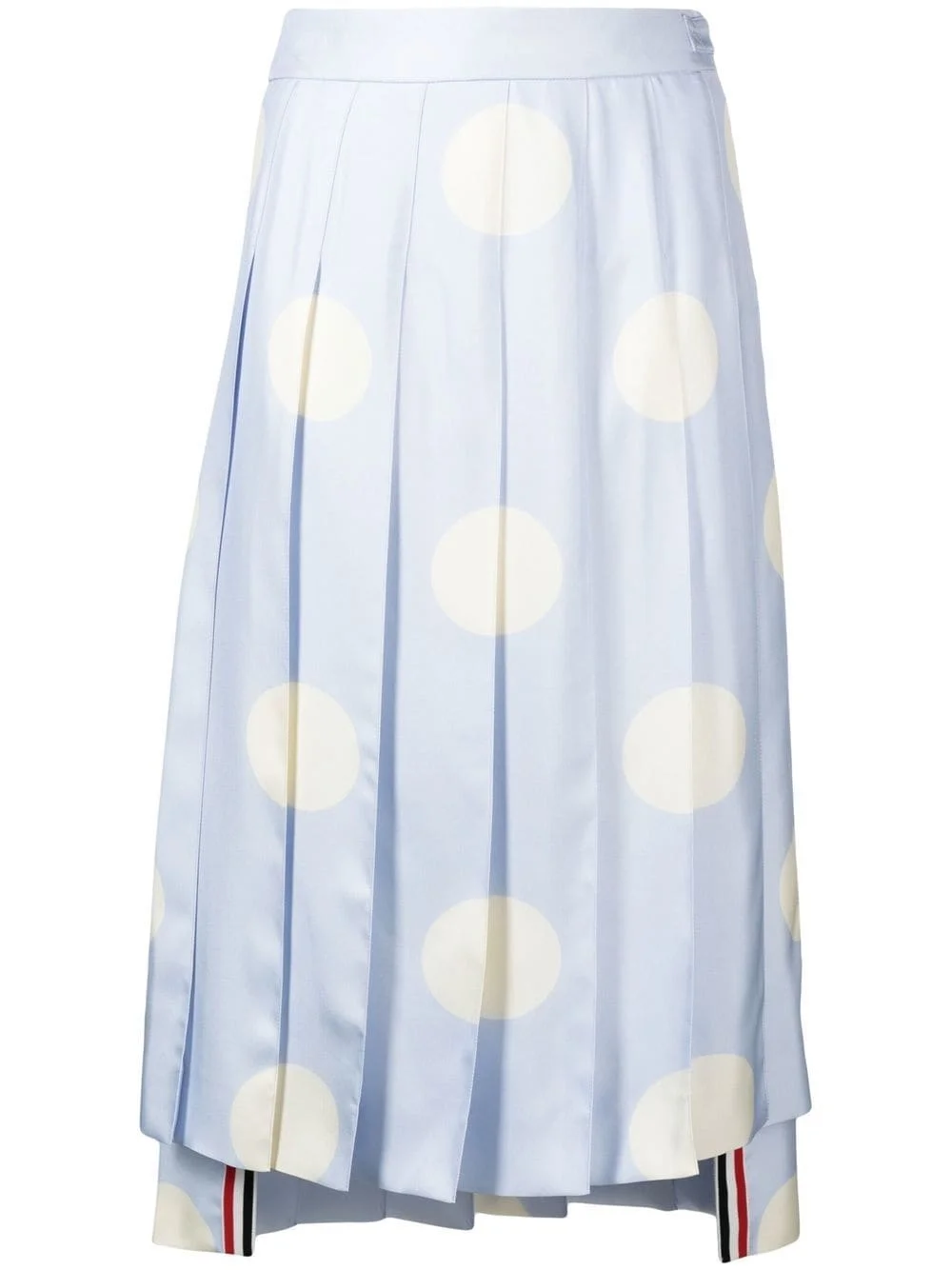polka-dot print pleated silk skirt light blue silk fully pleated bold polka dot print high-waisted high-low hem signature grosgrain loop tab Made in Italy Composition Outer: Silk 100% Lining: Silk 100%
