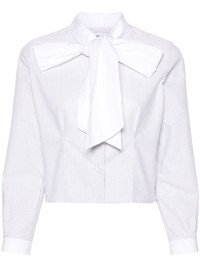 pussy-bow collar cotton blouse Highlights - Grey/white - Cotton - Poplin texture - Vertical stripe pattern - Signature grosgrain loop tab - Pussy-bow collar - Front button fastening - Long sleeves - Buttoned cuffs - Hem gusset - Straight hem - Cropped Made in Italy Composition Cotton 100% SIZE & FIT Model measurements Height 5 ft 11 in(1.8 m) Bust/Chest 32.67 in(83 cm) Hips 36.22 in(92 cm) Waist 24.4 in(62 cm) FittingInformation Designed for a slim fit that sits just away from the body offering a close yet comfortable fit This piece fits true to size – take your usual size
