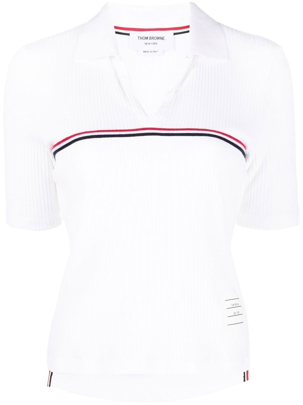 ribbed cotton polo top Lending the polo shirt a casual touch, Thom Browne crafts the classic silhouette in cotton with a ribbed construction. The top's spread collar adds to its laid-back appeal. Made in Italy Composition Cotton 100% SIZE & FIT Model measurements Height 5 ft 10 in(1.78 m) Bust/Chest 33.07 in(84 cm) Hips 35.82 in(91 cm) Waist 25.98 in(66 cm) FittingInformation This piece fits true to size. We recommend you get your regular size Cut for a slim fit Made with a mid-weight fabric