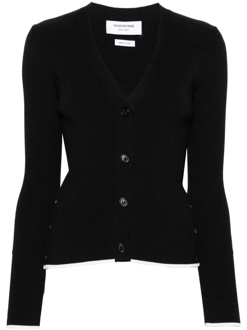 ribbed wool-blend cardigan Highlights - Black - Wool-silk blend - Ribbed knit - Contrasting border - V-neck - Front button fastening - Long sleeves - Button fastening side slits - Straight hem Made in Italy Composition Wool 70%, Silk 30% SIZE & FIT Model measurements Height 5 ft 10 in(1.77 m) Bust/Chest 33.07 in(84 cm) Hips 37 in(94 cm) Waist 24.8 in(63 cm) FittingInformation Designed for a slim fit that sits just away from the body offering a close yet comfortable fit Made with a lightweight knit, this piece offers some stretch This piece fits true to size – take your usual size