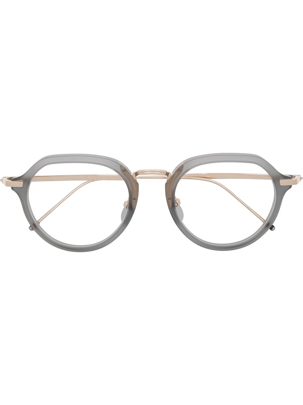 round-frame glasses Thom Browne Eyewear is renowned for delivering sleek eyewear options with signature details. These glasses feature round frames with gold-tone arms and are embellished with the RWB stripes on the tips. Imported Composition Metal 100%