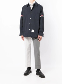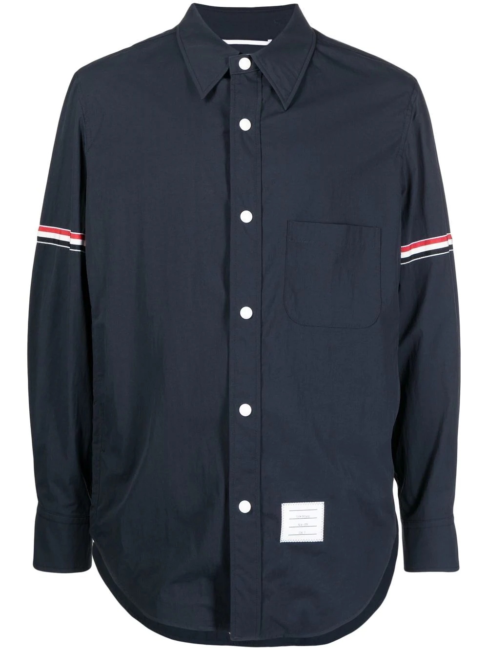 RWB armband pique shirt jacket Inspired by the construction of suits, Thom Browne showcases the brand's distinctive design style in the classic silhouette of this long-sleeve shirt. Featuring a classic collar and front button fastening, the label's iconic grosgrain trim is showcased at the sleeves. Highlights - Blue - Classic collar - Front button fastening - Long sleeves - Grosgrain ribbon trim - Logo patch to the front Imported Composition Body: Nylon 100% SIZE & FIT Model measurements Height 6 ft 0 in(1.83 m) Bust/Chest 37.79 in(96 cm) Hips 37 in(94 cm) Waist 30.31 in(77 cm) Measurement CHEST 50.39 in(128 cm) SLEEVE LENGTH 27.16 in(69 cm) Shoulder Width 20.07 in(51 cm) FittingInformation This piece fits true to size. We recommend you get your regular size Cut for a loose fit Made with a mid-weight non-stretch fabric