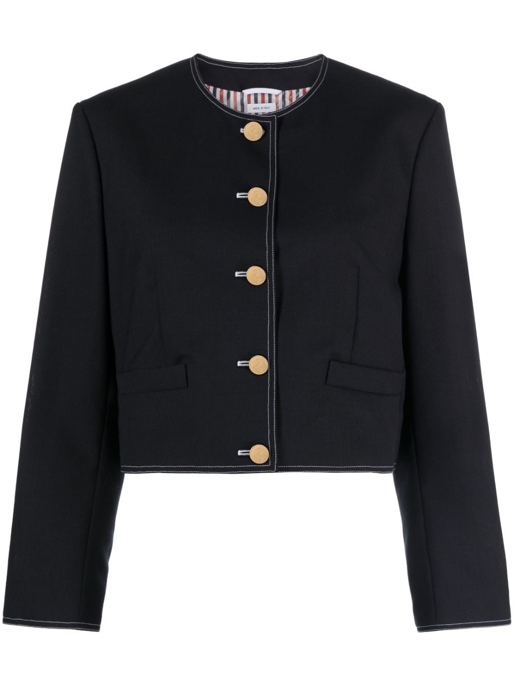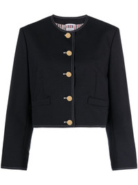 RWB-detail wool cropped jacket This jacket illustrates Thom Browne's ability to lend tailored pieces a quirky touch. It is decorated with a patch on the rear with the brand's RWB stripe, lending it a fun, unexpected touch. Highlights - Black - Wool - Rwb stripe - Contrast stitching - Round neck - Front button fastening - Long sleeves - Cropped - Central rear vent - Striped lining Made in Italy Composition Lining: Cupro 100% Outer: Wool 100% SIZE & FIT Model measurements Height 5 ft 9 in(1.75 m) Bust/Chest 31.49 in(80 cm) Hips 34.05 in(86.5 cm) Waist 24.21 in(61.5 cm) Measurement SLEEVE LENGTH 22.44 in(57 cm) LENGTH 19.29 in(49 cm) WAIST 40.94 in(104 cm) BUST 41.73 in(106 cm) FittingInformation Designed for a boxy fit, intended for a loose fit throughout The vented hem offers movement at the rear Made from a midweight non-stretch fabric This piece fits true to size – take your usual size