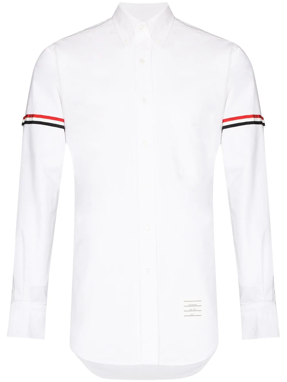 RWB long-sleeve shirt Thom Browne’s preppy American aesthetic informs this white shirt, accented with the brand's signature RWB-stripe at both sleeves. Crafted in the USA from cotton oxford, it’s cut to a slim fit and finished with another brand code: the grosgrain loop tab. Made in Italy Composition Cotton 100% SIZE & FIT Model measurements Height 6 ft 3 in(1.91 m) Bust/Chest 37 in(94 cm) Hips 37.79 in(96 cm) Waist 28.34 in(72 cm) Measurement CHEST 39.37 in(100 cm) SLEEVE LENGTH 22.83 in(58 cm) LENGTH 29.52 in(75 cm) WAIST 33.85 in(86 cm) FittingInformation Designed for a regular fit, allowing for a comfortably loose fit throughout the body Made from a midweight non-stretch fabric This piece fits true to size – take your usual size Washing instructions Machine Wash