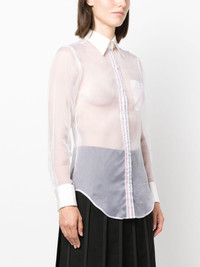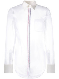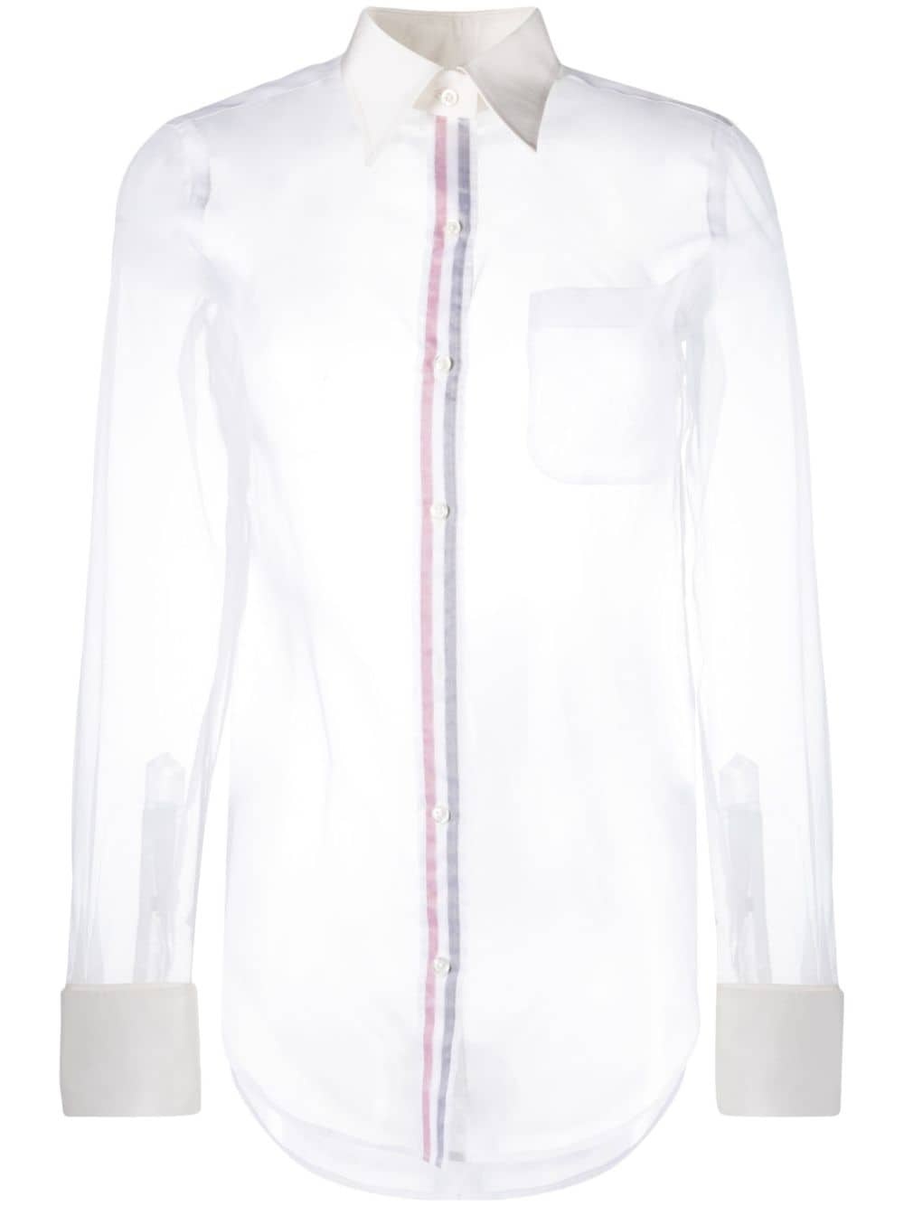RWB-placket transparent silk shirt A classic with a Thom Browne twist, this shirt crafted from silk stands out due to its transparent design. The slim-fit silhouette also features a desaturated RWB signature motif across the button placket. Highlights - White - Silk - Transparent design - Rwb stripe - Pointed flat collar - Front button placket - Long sleeves - Buttoned cuffs - Curved hem Made in Italy Composition Outer: Silk 100% Silk 100% SIZE & FIT Model measurements Height 5 ft 10 in(1.77 m) Bust/Chest 35.03 in(89 cm) Hips 35.03 in(89 cm) Waist 23.62 in(60 cm) FittingInformation Designed for a slim fit that sits just away from the body offering a close yet comfortable fit Made from a lightweight non-stretch fabric This piece fits true to size – take your usual size