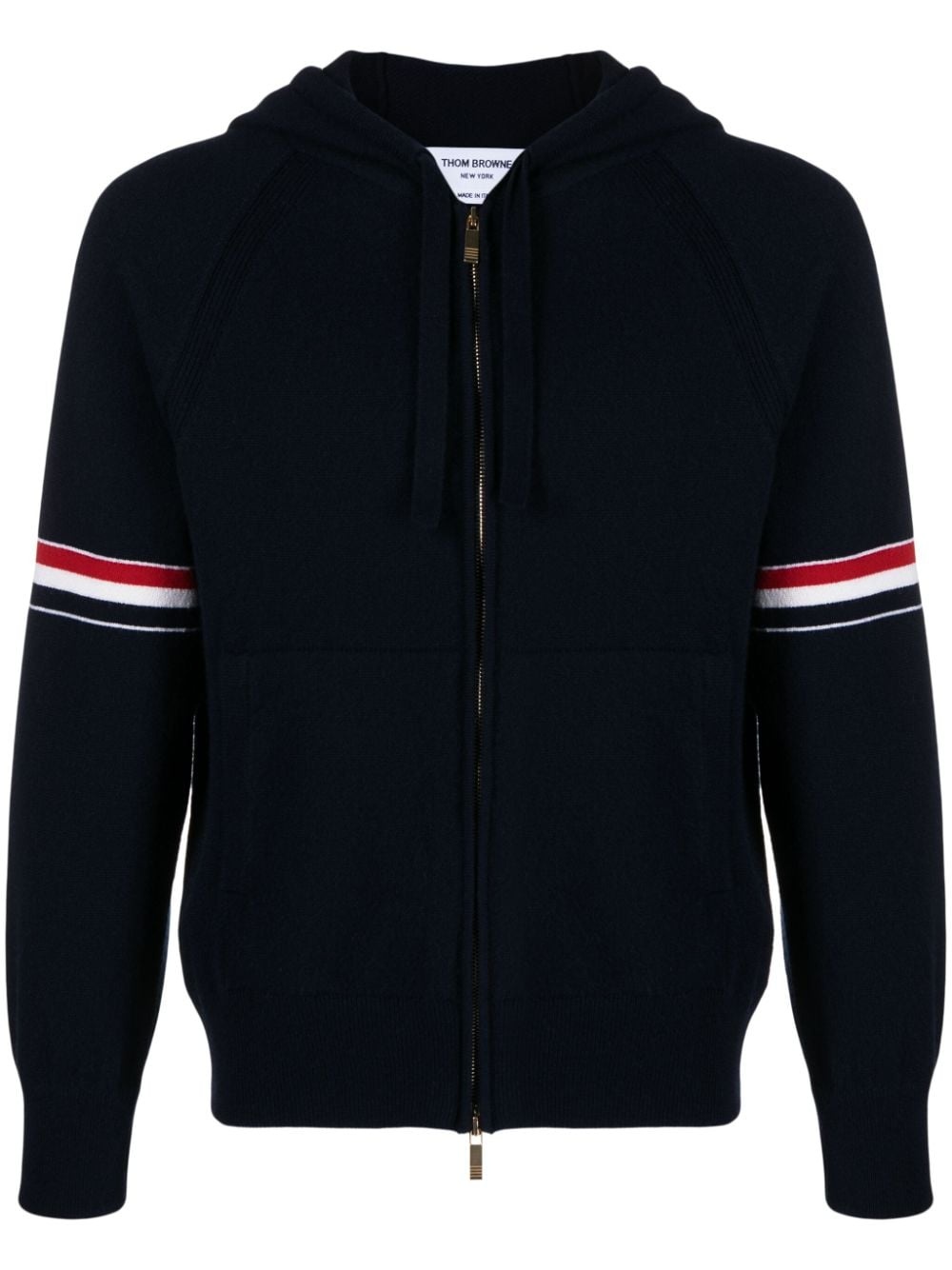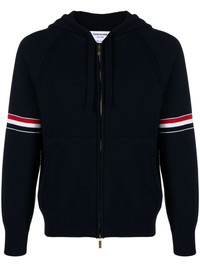 RWB stripe cashmere hoodie Thom Browne is renowned for enhancing classic designs with signature house hallmarks. A case in point, this cashmere hoodie is adorned with the brand’s RWB stripe trims and an iconic grosgrain loop at the nape. Highlights - Navy blue - Cashmere - Knitted construction - Patterned intarsia knit - Brushed effect - Drawstring hood - Front zip fastening - Branded zip puller - Long sleeves - Rwb stripe - Ribbed cuffs and hem - Two front pouch pockets - Signature grosgrain loop tab to the rear - Straight hem Made in Italy Composition Cashmere 100% SIZE & FIT Model measurements Height 6 ft 2 in(1.87 m) Bust/Chest 36.41 in(92.5 cm) Hips 37 in(94 cm) Waist 29.52 in(75 cm) FittingInformation Designed for a relaxed fit, this piece allows for comfort and movement when worn Made with a midweight knit, this piece offers some stretch This piece fits true to size – take your usual size Measurement CHEST 40.15 in(102 cm) LENGTH 22.83 in(58 cm) SLEEVE LENGTH 31.88 in(81 cm)