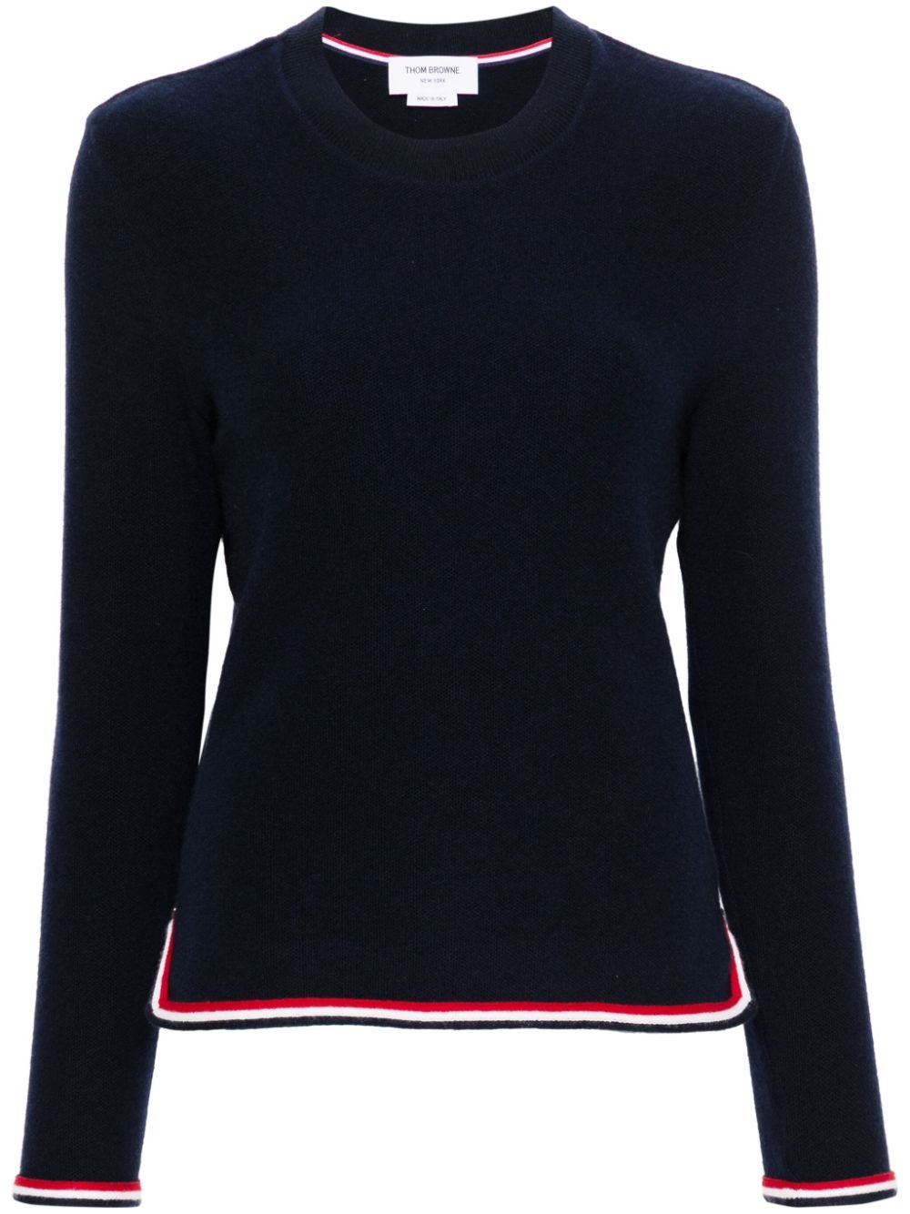 RWB-stripe cashmere jumper Highlights - Navy blue - Cashmere - Knitted construction - Ribbed crew neck - Long sleeves - Short side slits - Rwb stripe to the cuffs and hem - Signature grosgrain loop tab - Straight hem Made in Italy Composition Cashmere 100% SIZE & FIT Model measurements Height 5 ft 10 in(1.77 m) Bust/Chest 34.25 in(87 cm) Hips 37.4 in(95 cm) Waist 29.13 in(74 cm) FittingInformation Designed for a relaxed fit, this piece allows for comfort and movement when worn Made with a midweight knit, this piece offers some stretch This piece fits true to size – take your usual size