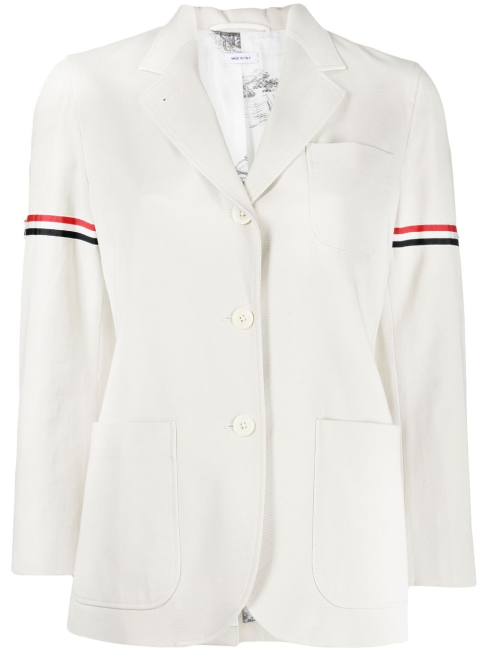 RWB-stripe cotton blazer An emblematic signature of the brand, the RWB stripes celebrate Thom Browne's American heritage by reflecting the USA's national colours. In this cotton blazer, the trademark punctuates the design, encircling the sleeves for an instantly recognisable look. Highlights - Off-white - Cotton - Rwb stripe - Notched lapels - Three front patch pockets - Long sleeves - Buttoned cuffs - Central rear vent - Straight hem Made in Italy Composition Cotton 100% SIZE & FIT Model measurements Height 5 ft 9 in(1.76 m) Bust/Chest 31.1 in(79 cm) Hips 35.03 in(89 cm) Waist 24.4 in(62 cm) FittingInformation Designed to be unstructured, offering a loose fit throughout The vented hem offers movement at the rear Made from a midweight non-stretch fabric This piece fits true to size – take your usual size Washing instructions Machine Wash