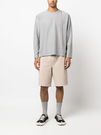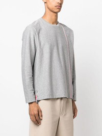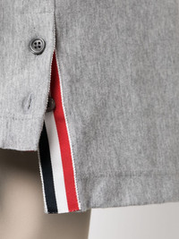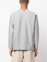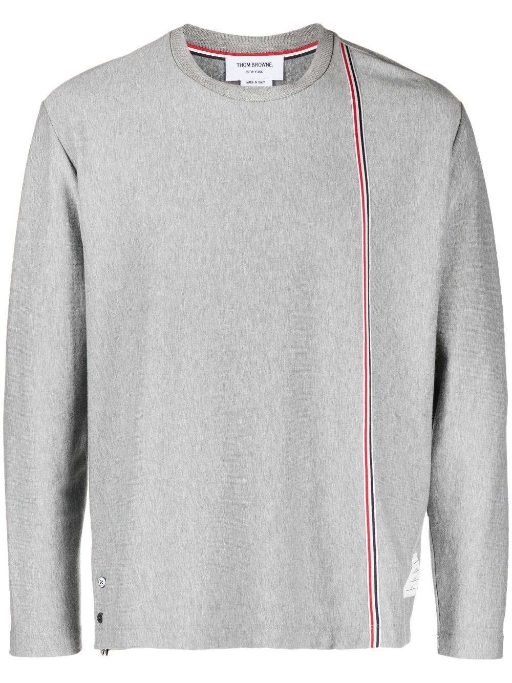 RWB stripe cotton T-shirt This grey T-shirt is infused with Thom Browne's signature aesthetic. Boasting a buttoned step hem, the silhouette is crossed by the recognisable RWB grosgrain trim -- a celebration of the label's American roots. Highlights - Light grey/red/navy blue - Cotton - Jersey knit - Grosgrain ribbon trim - Rwb stripe - Signature grosgrain side tabs - Crew neck - Long sleeves - Step hem Made in Italy Composition Outer: Cotton 100% SIZE & FIT Model measurements Height 6 ft 2 in(1.87 m) Bust/Chest 38.18 in(97 cm) Hips 36.61 in(93 cm) Waist 29.13 in(74 cm) FittingInformation Designed for a relaxed fit, this piece allows for comfort and movement when worn Made from a midweight non-stretch fabric, this piece offers minimal elasticity when worn This piece fits true to size – take your usual size Washing instructions Dry Clean Only
