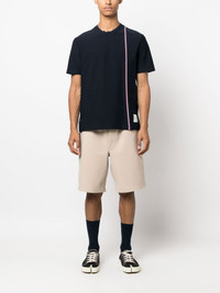 RWB stripe cotton T-shirt The casual nature of this navy cotton T-shirt is elevated with Thom Browne's signature preppy details – note the buttoned step hem and contrast line down the front, both of which boast the label’s RWB grosgrain trims in a nod to the label's American roots. Highlights - Navy blue - Cotton - Jersey knit - Grosgrain ribbon trim - Rwb stripe - Signature grosgrain side tabs - Crew neck - Short sleeves - Step hem Made in Italy Composition Outer: Cotton 100% SIZE & FIT Model measurements Height 6 ft 2 in(1.87 m) Bust/Chest 38.18 in(97 cm) Hips 36.61 in(93 cm) Waist 29.13 in(74 cm) Measurement CHEST 44.09 in(112 cm) FittingInformation Designed for a relaxed fit, this piece allows for comfort and movement when worn Made from a midweight non-stretch fabric, this piece offers minimal elasticity when worn This piece fits true to size – take your usual size Washing instructions Dry Clean Only