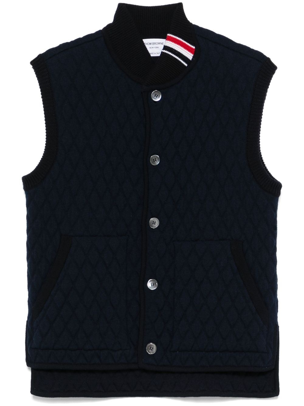RWB stripe-detail quilted vest Highlights - Oxford blue - Front button fastening - Two front pouch pockets - Short side slits - Unlined Made in Italy Composition Virgin Wool 70%, Polypropylene 28%, Spandex/Elastane 2% SIZE & FIT Model measurements Height 6 ft 2 in(1.87 m) Bust/Chest 37.79 in(96 cm) Hips 37.79 in(96 cm) Waist 30.31 in(77 cm) FittingInformation Designed for a regular fit, allowing for a comfortably loose fit throughout the body Made from a quilted non-stretch fabric, giving it no natural elasticity Washing instructions Dry Clean Only