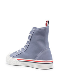 RWB-stripe high-top sneakers Realised in a breezy sky-blue hue, these sneakers showcase a casual side to Thom Browne. The canvas pair is adorned with the brand's RWB stripe at the sole and heel for a recognisable branded look. Highlights - Sky blue - Canvas - Rwb stripe - Signature grosgrain loop tab - Logo patch at the tongue - Front lace-up fastening - Round toe - Flat rubber sole Made in Italy Composition Outer: Canvas 100% Lining: Fabric 100%, Calf Leather 100% Sole: Rubber 100% SIZE & FIT Measurement HEIGHT 6.29 in(16 cm) Sole height 1.37 in(3.5 cm)