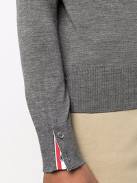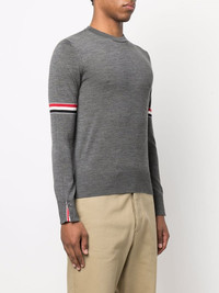 RWB-stripe jumper A key brand motif, the red, white and blue stripe details this jumper from Thom Browne, adding bold colour to the understated design for an eye-catching twist. Highlights - Grey - Merino wool - Rwb stripe - Signature grosgrain loop tab - Crew neck - Long sleeves - Buttoned cuffs Made in Italy Composition Merino 100% SIZE & FIT Model measurements Height 6 ft 1 in(1.85 m) Bust/Chest 38.58 in(98 cm) Hips 37 in(94 cm) Waist 30.31 in(77 cm) Measurement CHEST 37 in(94 cm) LENGTH 23.22 in(59 cm) SLEEVE LENGTH 23.62 in(60 cm)
