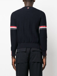 RWB-stripe long-sleeve jumper Instantly recognisable as Thom Browne by the signature grosgrain loop, this long-sleeve jumper is constructed from sophisticated materials and has a sleek silhouette that reflects the brand's tailored approach to garment construction. Highlights - Navy blue - Virgin wool - Rwb stripe - Round neck - Long sleeves Made in Italy Composition Virgin Wool 100% SIZE & FIT Model measurements Height 6 ft 2 in(1.87 m) Bust/Chest 36.41 in(92.5 cm) Hips 37 in(94 cm) Waist 29.52 in(75 cm) FittingInformation Designed for a slim fit, offering a comfortable fit that sits just away from the body Made with a midweight knit, this piece offers some stretch This piece fits true to size – take your usual size Measurement CHEST 40.15 in(102 cm) SLEEVE LENGTH 24.4 in(62 cm) LENGTH 24.4 in(62 cm)