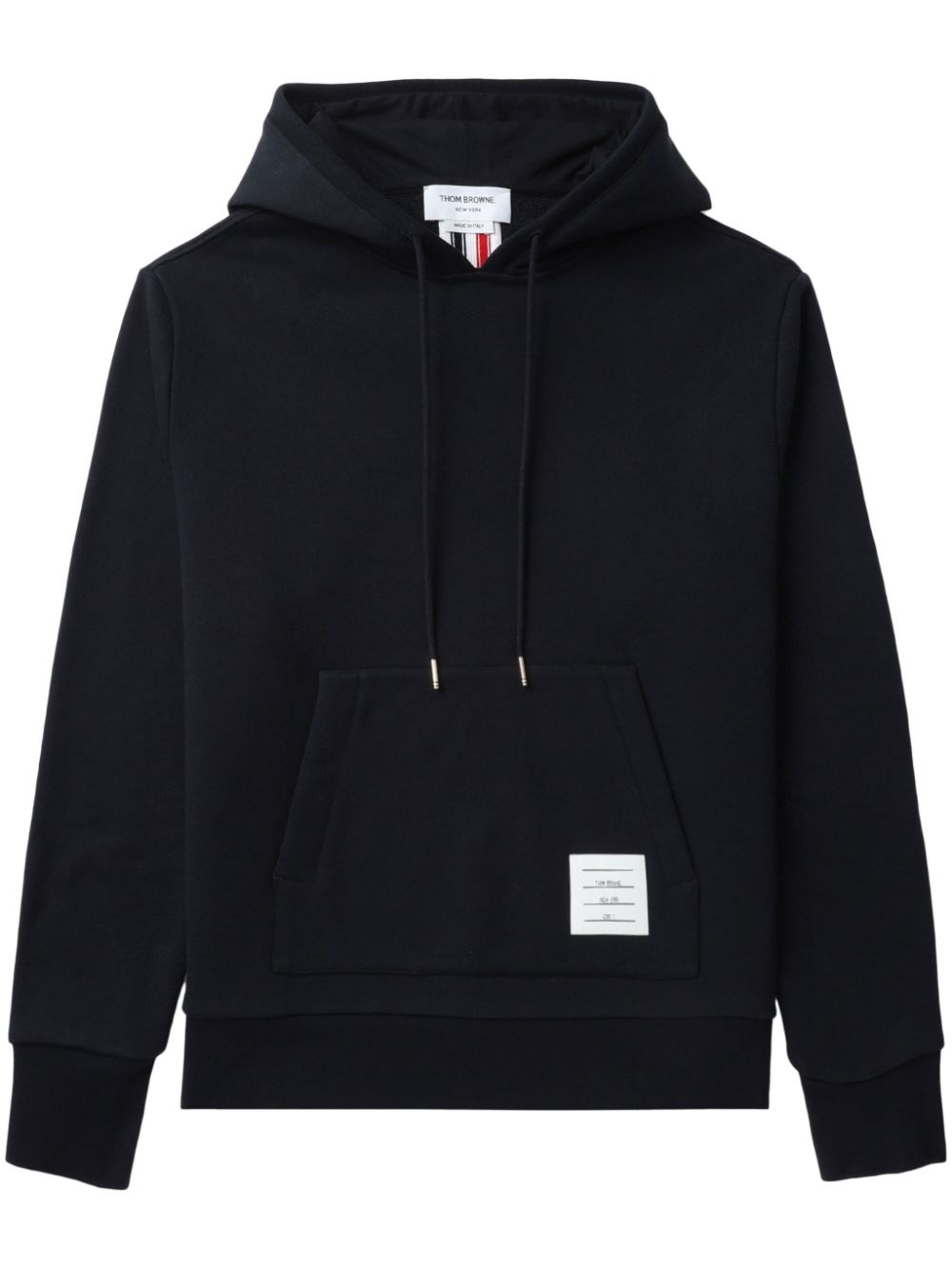 RWB stripe loopback hoodie Crafted in Italy from a navy blue cotton jersey, this Thom Browne hoodie is minimally detailed with the brand's signature red, white and blue stripe to the rear for a sophisticated finish. Highlights - Navy blue - Cotton - Jersey fleece - Signature stripe detail to the rear - Logo patch to the front - Drawstring hood - Front pouch pocket - Long sleeves - Buttoned cuffs - Ribbed cuffs and hem Made in Italy Composition Cotton 100% SIZE & FIT Model measurements Height 6 ft 0 in(1.83 m) Bust/Chest 35.82 in(91 cm) Hips 37.79 in(96 cm) Waist 31.1 in(79 cm) Measurement CHEST 45.66 in(116 cm) SLEEVE LENGTH 29.92 in(76 cm) Shoulder Width 19.68 in(50 cm) Washing instructions Hand Wash