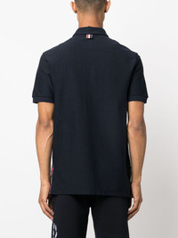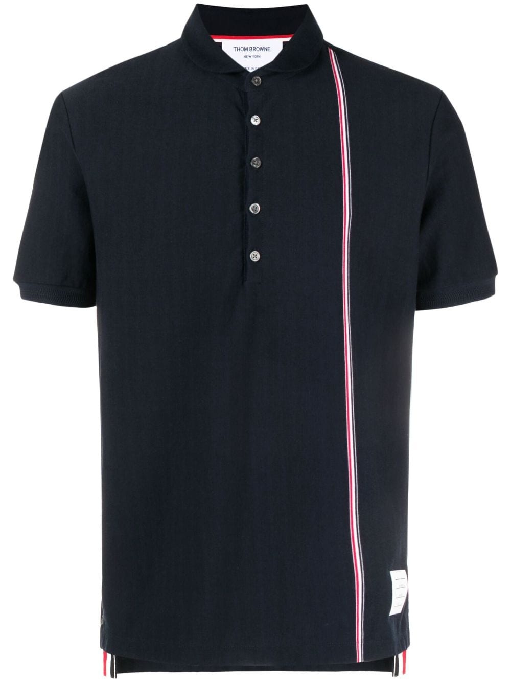 RWB stripe polo shirt A signature of the brand, the RWB stripes celebrate Thom Browne's American roots by mirroring the USA's national colours. Here, the trademark punctuates this blue polo shirt, crossing the silhouette for an instantly recognisable look. Highlights - Midnight blue/red/white - Cotton - Jersey knit - Grosgrain ribbon trim - Rwb stripe - Signature grosgrain side tabs - Club collar - Short front button fastening - Short sleeves - Straight hem Made in Italy Composition Outer: Cotton 100% SIZE & FIT Model measurements Height 6 ft 2 in(1.87 m) Bust/Chest 38.18 in(97 cm) Hips 36.61 in(93 cm) Waist 29.13 in(74 cm) FittingInformation Designed for a regular fit, this polo shirt offers a comfortable loose fit throughout the body Made from a midweight non-stretch fabric, this piece offers minimal elasticity when worn This piece fits true to size – take your usual size Washing instructions Dry Clean Only