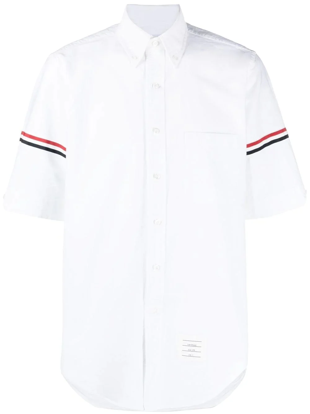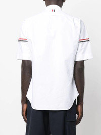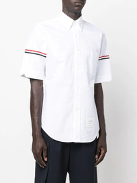 RWB stripe polo shirt Thom Browne's signature RWB stripe pattern is found throughout each collection of ready-to-wear and accessories. This white poplin design is finished with the logo along the sleeves while a contrasting logo patch sits at the hem. Made in Italy Composition Cotton 100% SIZE & FIT Model measurements Height 6 ft 2 in(1.87 m) Bust/Chest 36.41 in(92.5 cm) Hips 37 in(94 cm) Waist 29.52 in(75 cm) FittingInformation This piece fits true to size. We recommend you get your regular size Cut for a slim fit Made with a mid-weight non-stretch fabric Washing instructions Machine Wash
