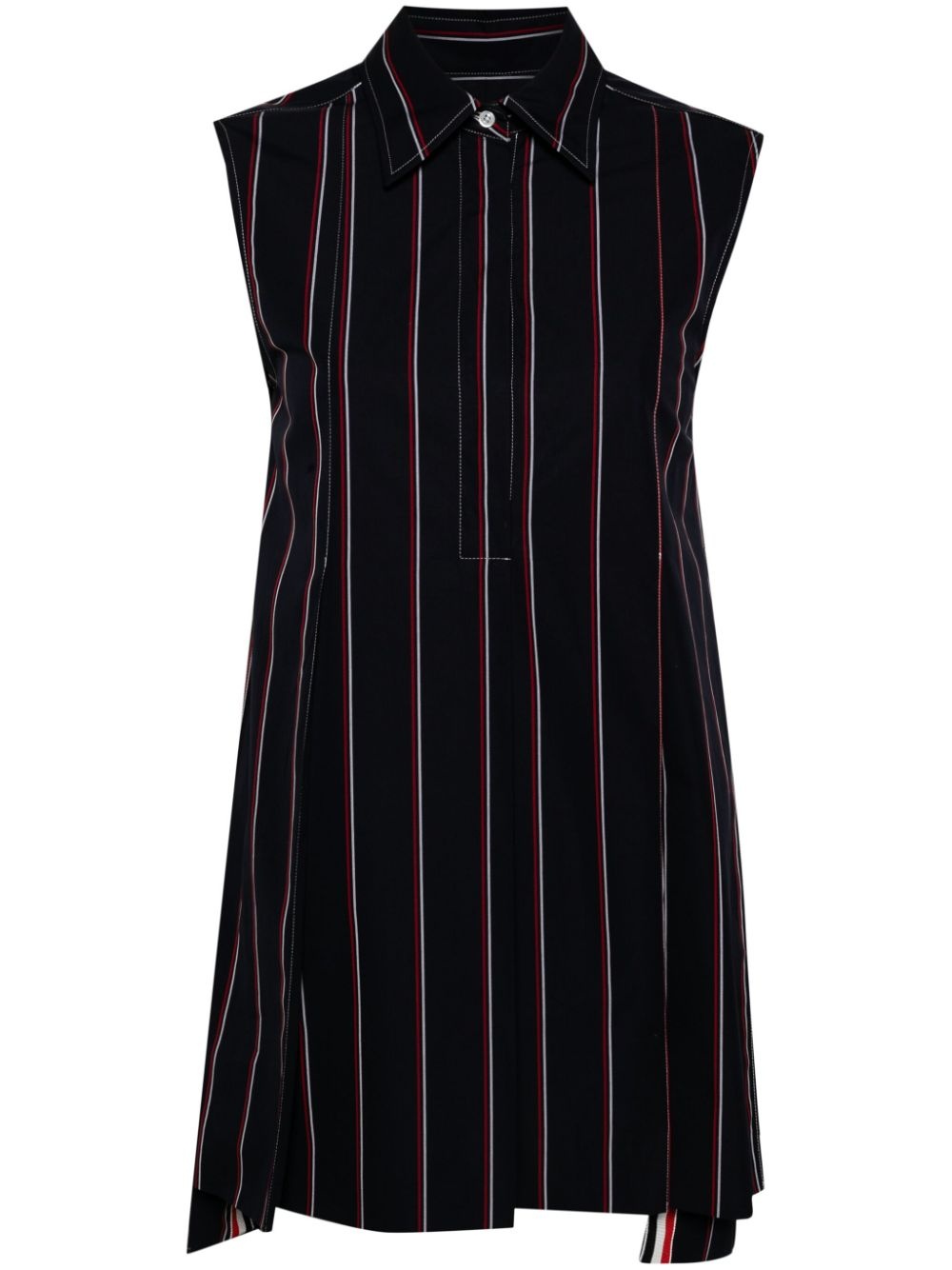 RWB-stripe shirt dress Highlights - Navy blue - Cotton - Poplin texture - Rwb stripe - Short front button fastening - Vertical stripe pattern - Pointed flat collar - Sleeveless - Pleat detailing - Unlined - High-low hem Made in Italy Composition Cotton 100% SIZE & FIT Model measurements Height 5 ft 9 in(1.76 m) Bust/Chest 31.88 in(81 cm) Hips 35.43 in(90 cm) Waist 24.8 in(63 cm) FittingInformation Designed for a relaxed fit, this piece allows for comfort and movement when worn Slightly short in length; consider your own measurements Made from a midweight non-stretch fabric This piece fits true to size – take your usual size Washing instructions Machine Wash